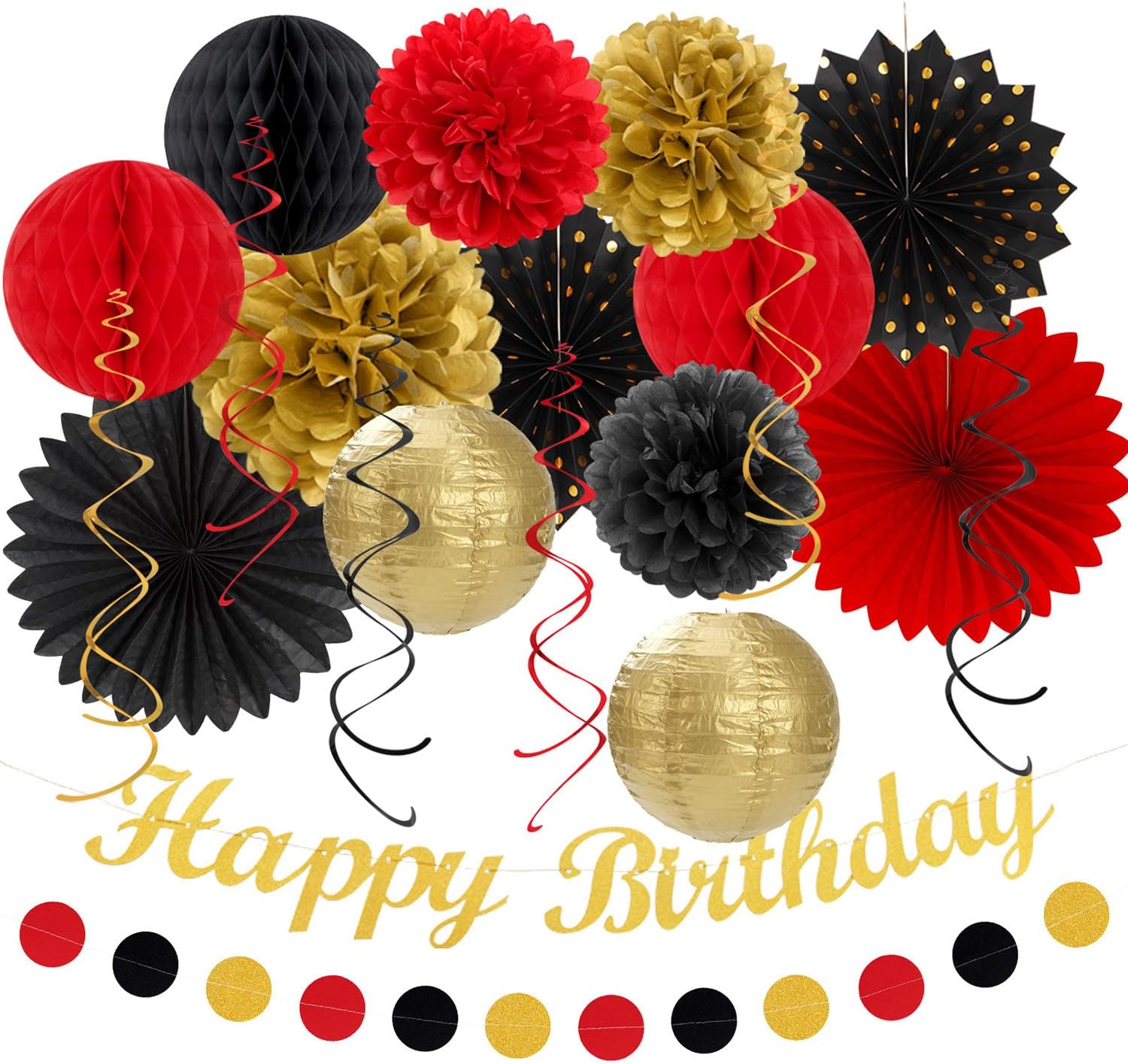 Red-Black Gold Casino-Theme Birthday Party-Decorations - 21pcs Happy Banner,Game Night Paper Lanterns,Tissue Pom Poms Flower Fan,Honeycomb Ball,Swirl Streamers Garland Supplies Women Men Decor Huglony