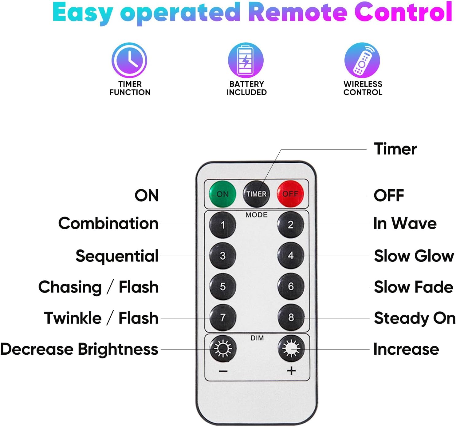 • Remote Control Convenience: Easily switch between 8 unique lighting modes and adjust brightness with the included remote; features timer for automatic 6 hours on, 18 hours off cycle.
