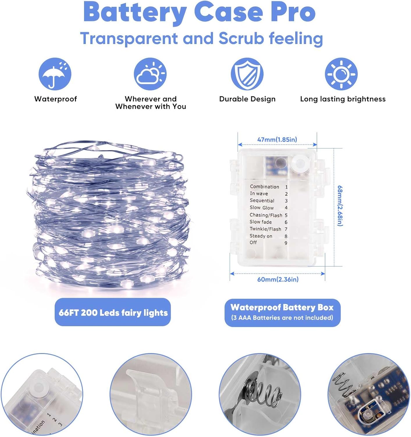 4 Pack 65.6 Ft. Battery Operated Outdoor String Lights with Remote & Timer, LED Cool Whit Fairy Lights, Waterproof Twinkle Lights for Bedroom, Dorm, Mason Jar, Wedding, Party, Christmas