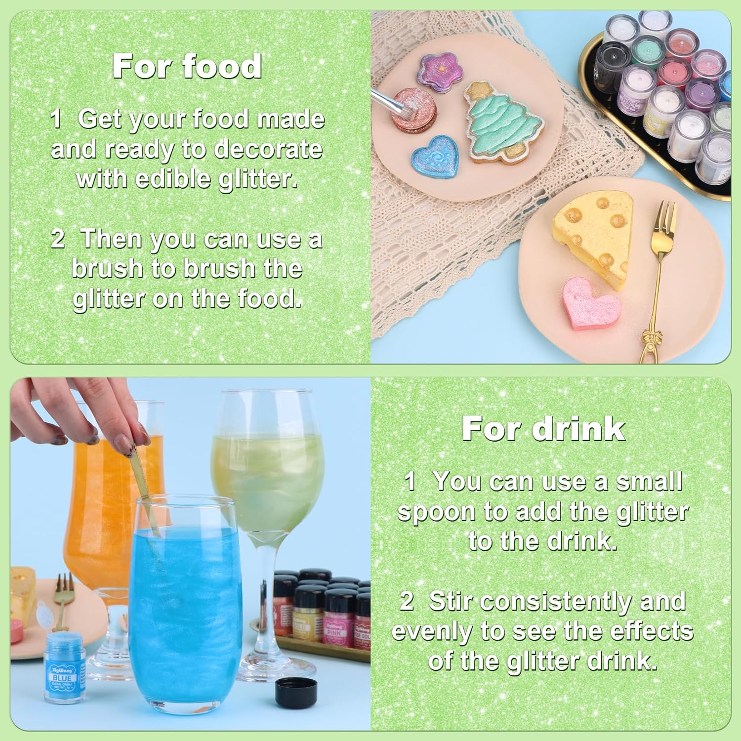 • 【Edible Glitter】: We offer edible glitter in a variety of colors, so you can match them to your party theme or personal preference to add a gorgeous shine to your drinks or baking!