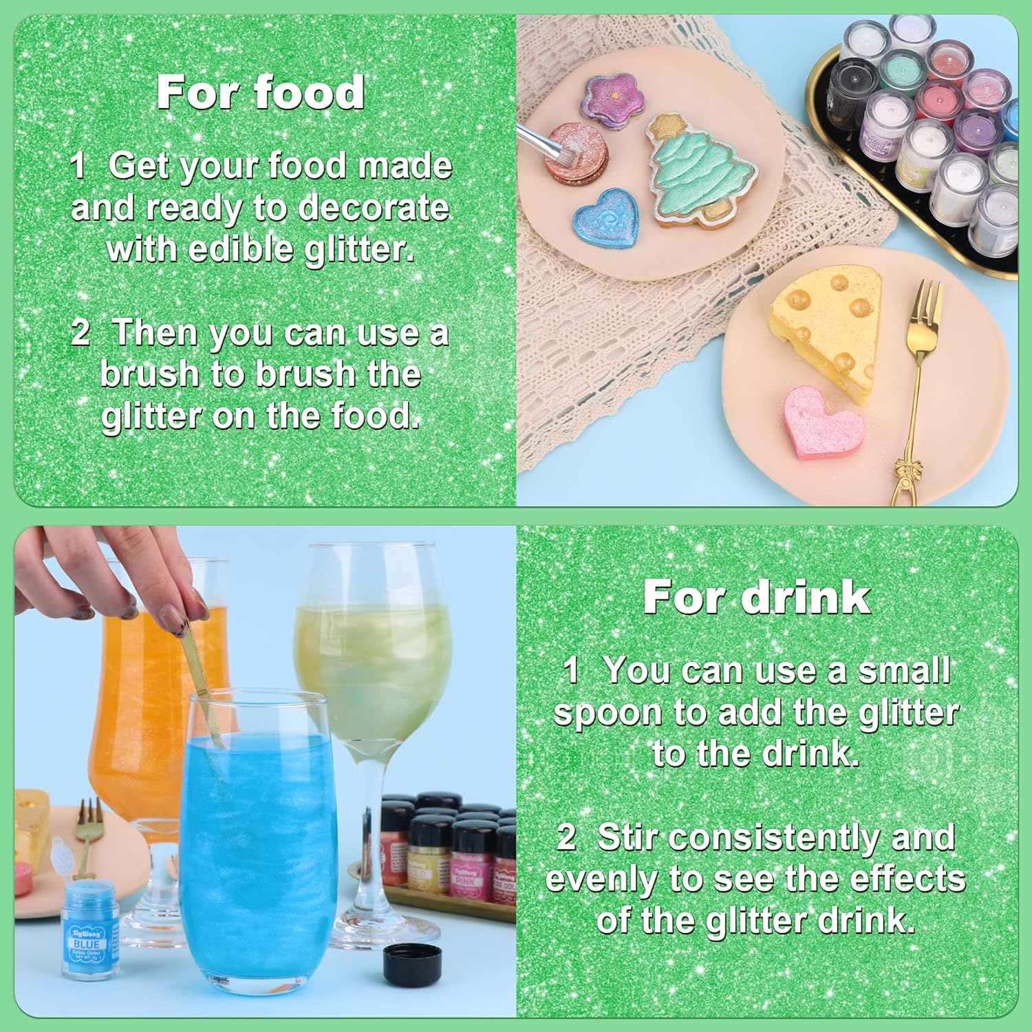 • 【Edible Glitter】: We offer edible glitter in a variety of colors, so you can match them to your party theme or personal preference to add a gorgeous shine to your drinks or baking!