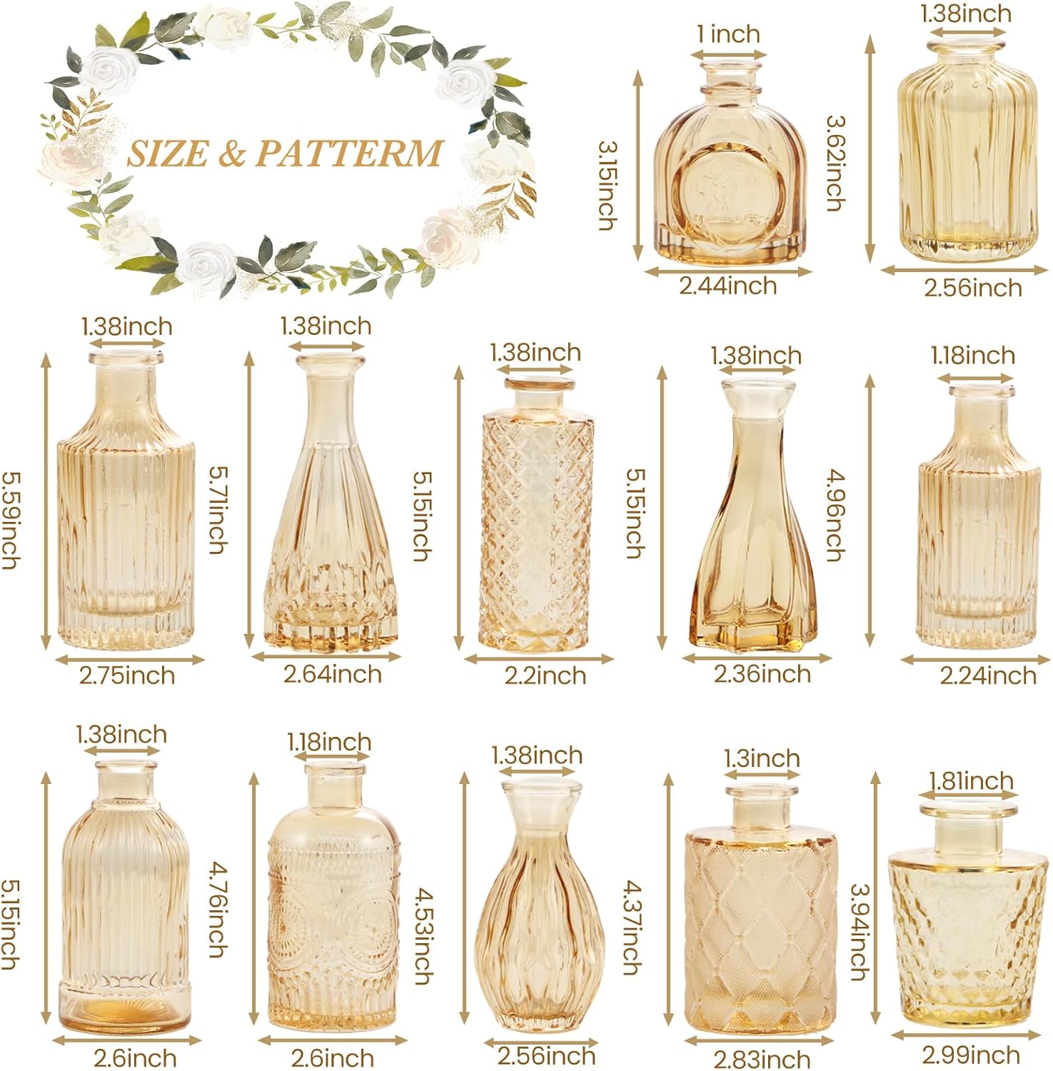 Amber Glass Bud Vases Set of 12, Gold Mini Flower Vase for Centerpieces, Small Vases in Bulk for Wedding Decorations, Vintage Vase for Table, Recepetion, Home Décor