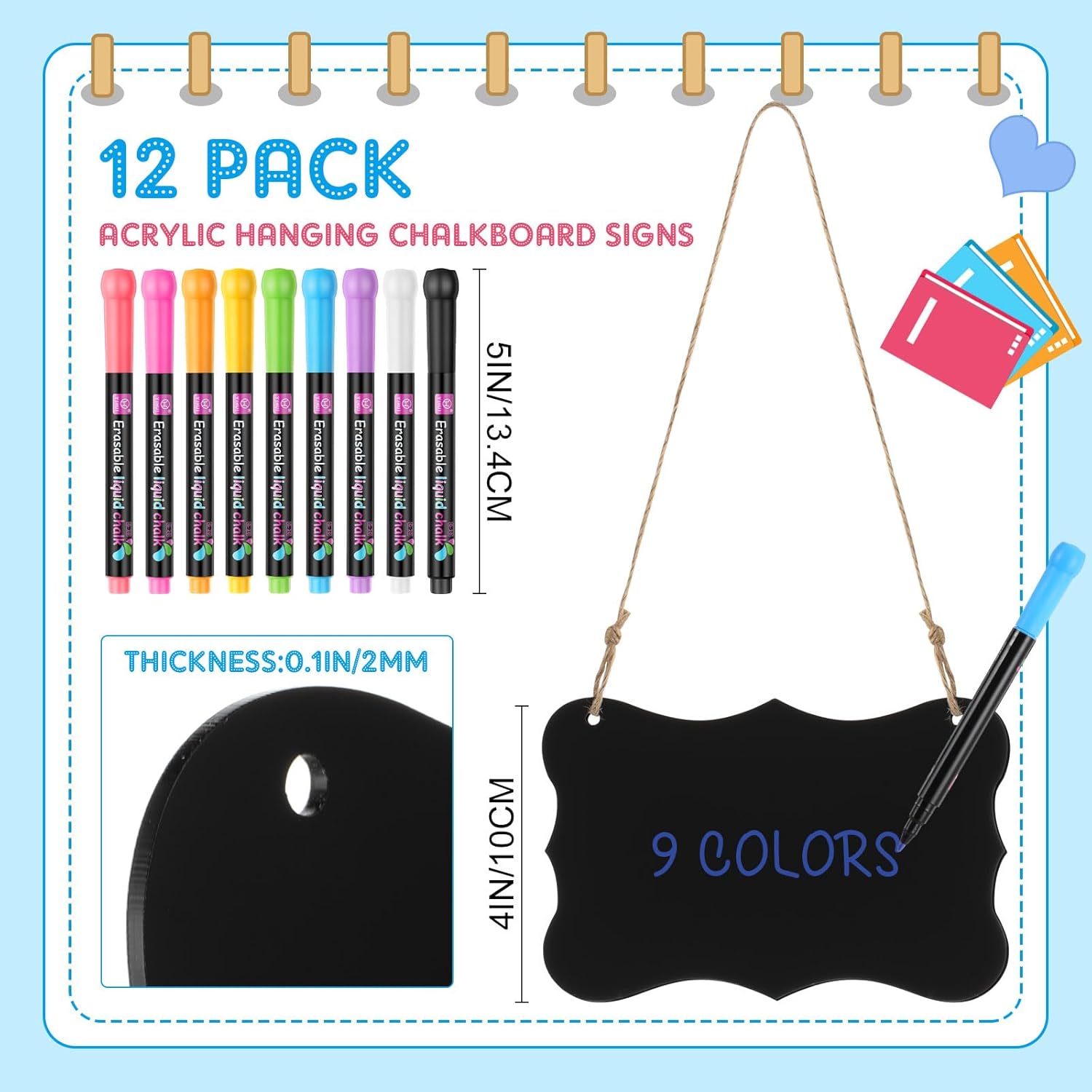 • Complete Set: when you buy this product, you not only get 12 chalk board, but also a set of 9 colorful liquid chalks, 9 colors, bright and easy to remove; Compared with traditional chalk, there is no dust flying, creating a healthier and more comfortable writing environment, which is a very cost effective choice