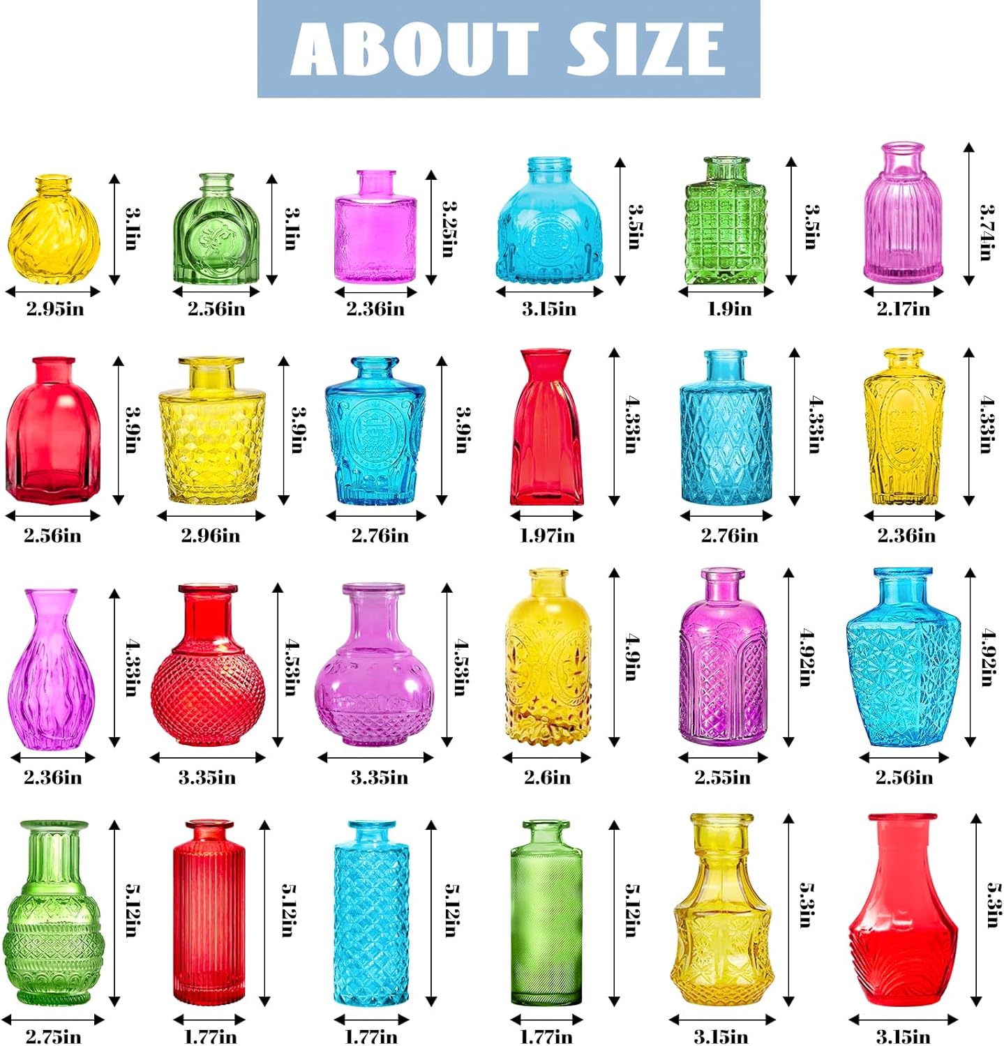 • Different Retro Designs: The set contains 24 small bud vases in bulk with different sizes, shapes and styles. The surface of mini vases bud vases in bulk are all embossed, exquisite, beautiful, unique and textured, and sparkles under the light. Note: Actual colors may vary slightly due to different monitors and lighting.