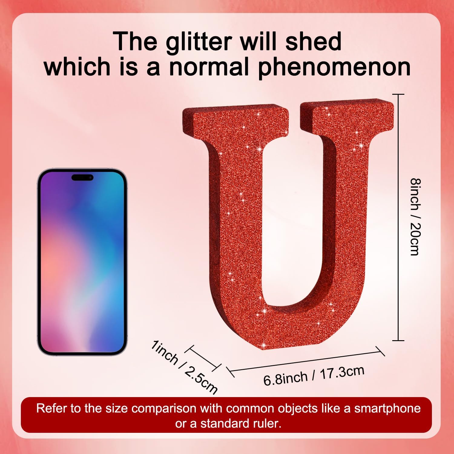 • ITEM INFORMATION AND SIZE: 1 Pcs * U Red Glitter Letter Ornament. Size: 8 * 5.8 * 1 Inches (20*15*2.5 CM). Before purchasing, Please check the size carefully to make sure it meets your needs