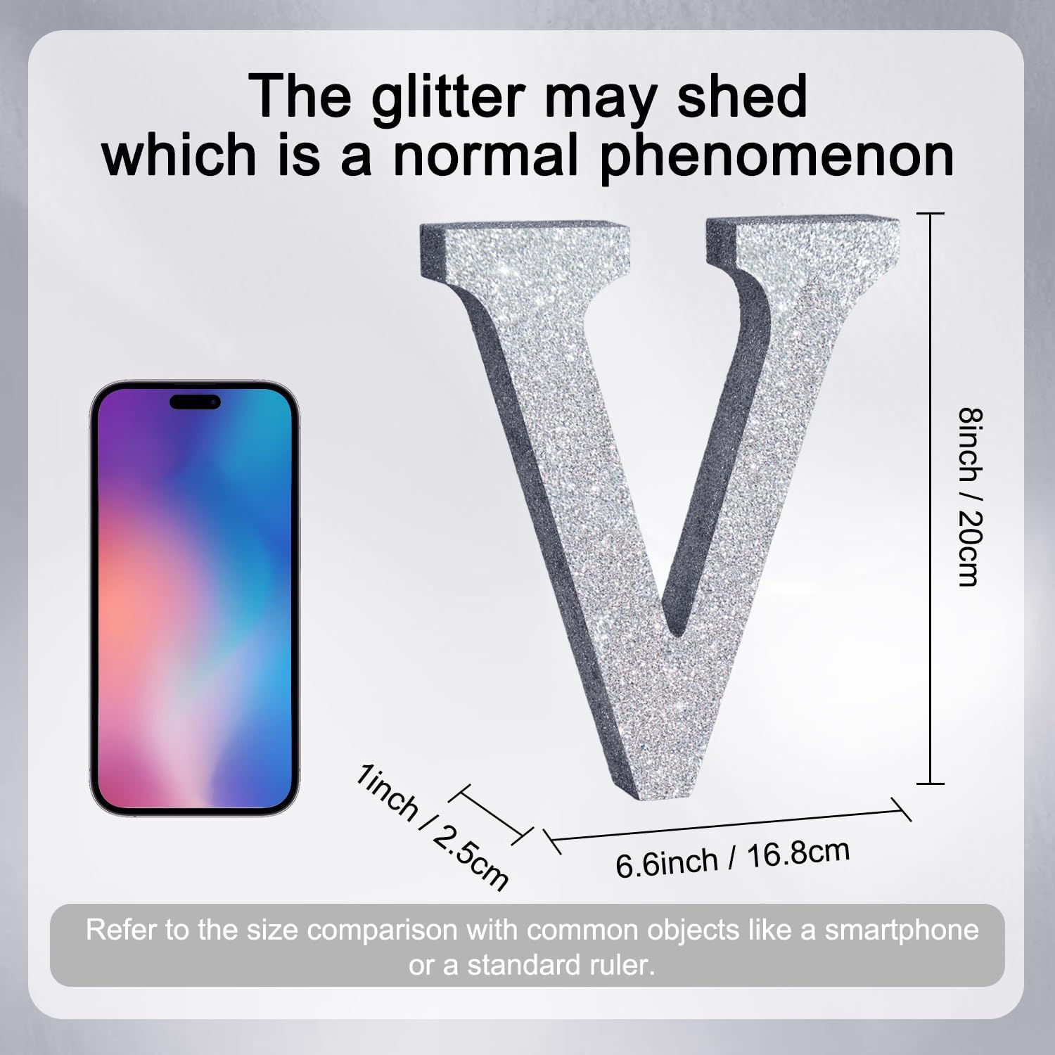 • ITEM INFORMATION AND SIZE: 1 Pcs * V Silver Glitter Letter Ornament. Size: 8 * 5.8 * 1 Inches (20*15*2.5 CM). Before purchasing, Please check the size carefully to make sure it meets your needs
