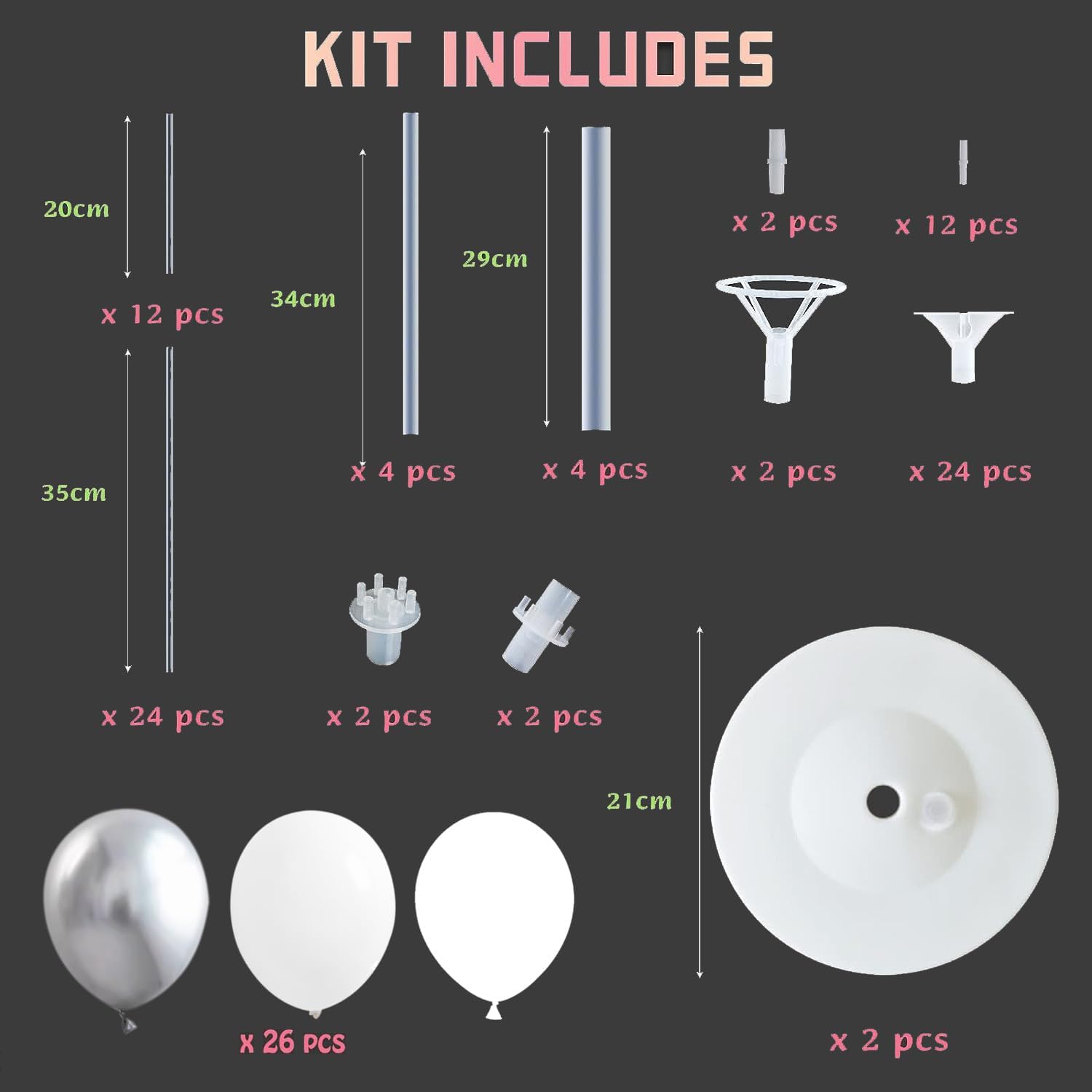 • 【Everything you need in one set!】2 Sets of Balloon Stand Kits, Includes 44 Unconnected Balloon Sticks, 24 Cups, 2 Big Cups, 4 of Which Are Tube Connectors, 12 Mini Union Joints,2 Union Joints,28pcs Balloons,2 Base.Each Balloon Stand Comes in 2 Different Height Sizes.Perfect Size for Table&Ground.