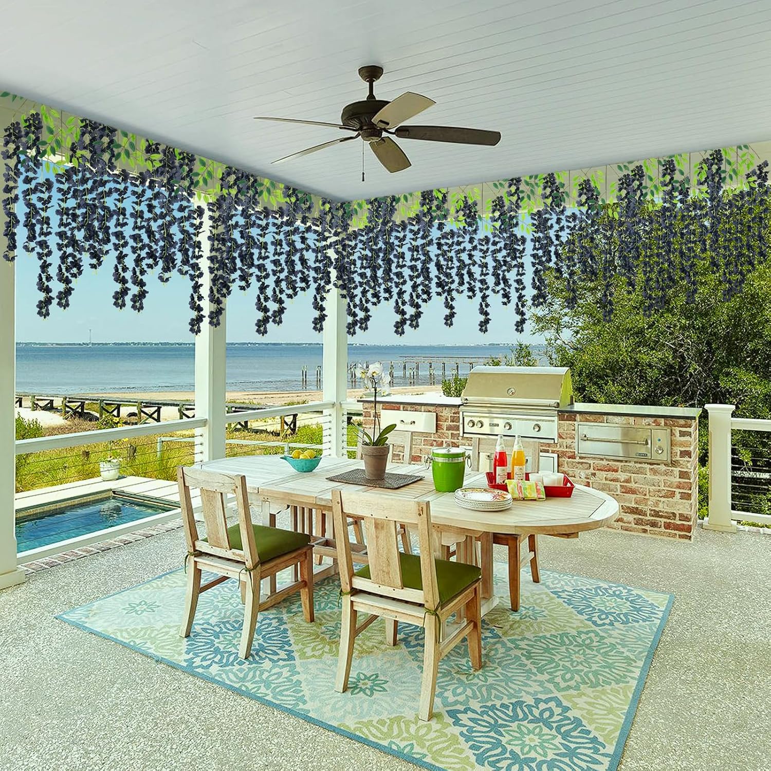 • 🌼Material - Silk and Plastic. The artificial wisteria hanging flowers are vibrantly colored, the veins of the leaves are distinct, look like real flowers, vivid wisteria petals has real natural-looking. These realistic and beautiful wisteria flower vines are perfect for home table arrangement, wedding decoration and living room party decoration. These wisteria garlands are also suitable for outdoor decoration.The petals and leaves are also very firm, can stand the test of time.