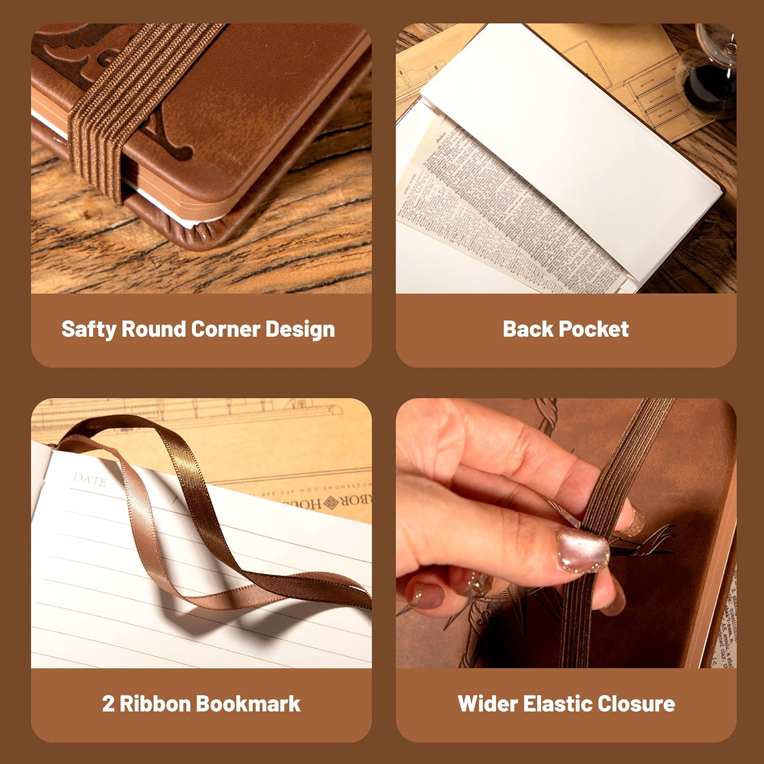 • 【Notebook Features】: Leather bound notebook has 2 Exquisite ribbon bookmarks to help you find content faster; 1 Elastic closure strap to keep the notebook closed; 1 leather stitched pen holder, can hold most pens; 1 Inner pocket for appointment cards, notes, receipts and more.