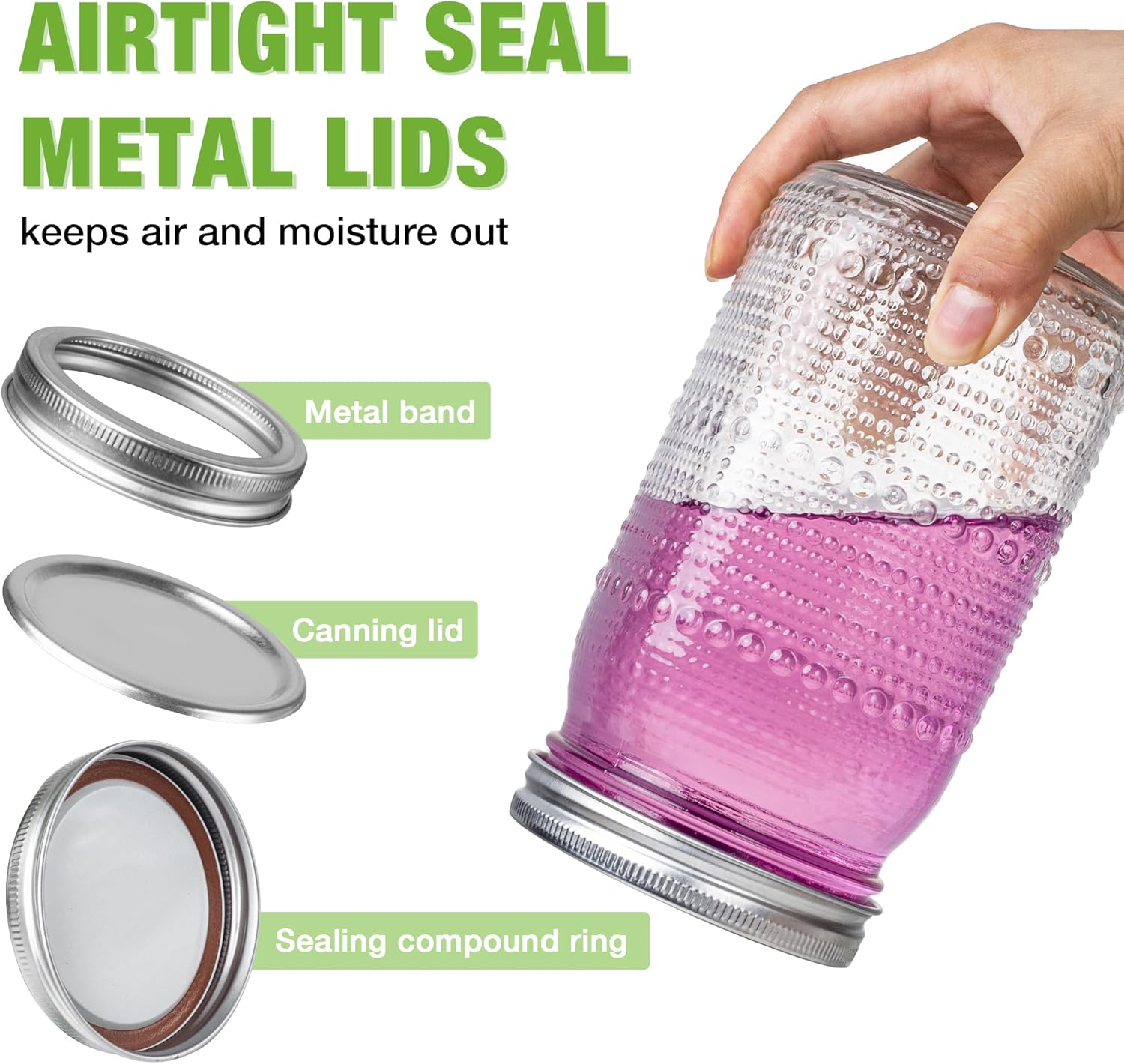 • AIRTIGHT SEAL - The split lid on large mason jars consists of a metal canning lid and band, 32 oz mason jars metal band with an airtight composite ring. The two-layer airtight lid ensures glass mason jars don't leak, insulates against air and moisture, extends the shelf life of the mason jars wide mouth contents, and maintains freshness and flavor.