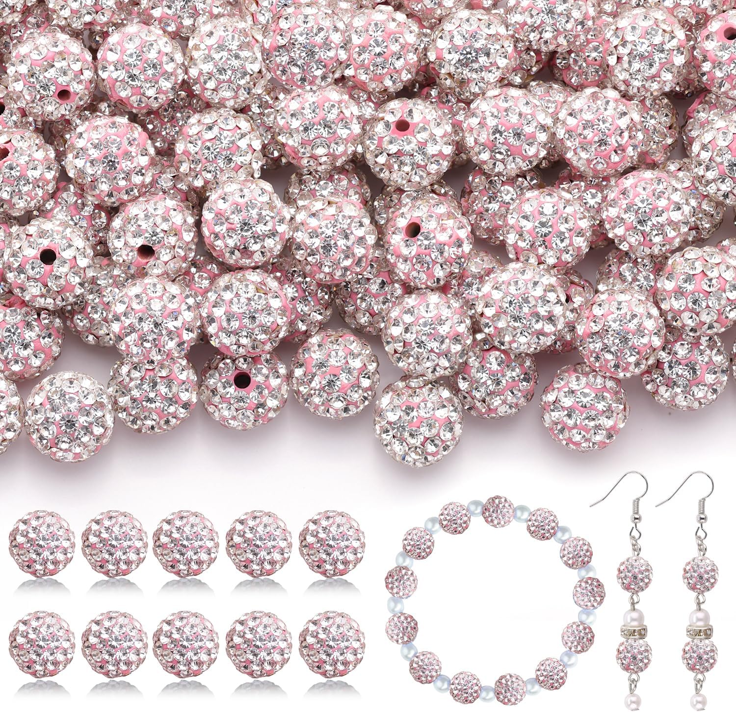 160pcs 10mm Rhinestone Beads for Jewelry Making, Pink White Shiny Round Disco Ball Beads Bulk, Sparkle Crystal Clay Christmas for Bracelet Baseball Necklace Earring Crafting and DIY