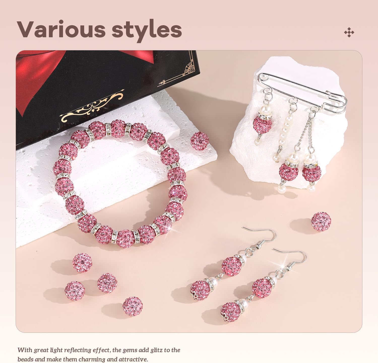 160pcs 10mm Rhinestone Beads for Jewelry Making, Dark Pink Shiny Round Disco Ball Beads Bulk, Sparkle Crystal Clay Christmas for Bracelet Baseball Necklace Earring Crafting and DIY