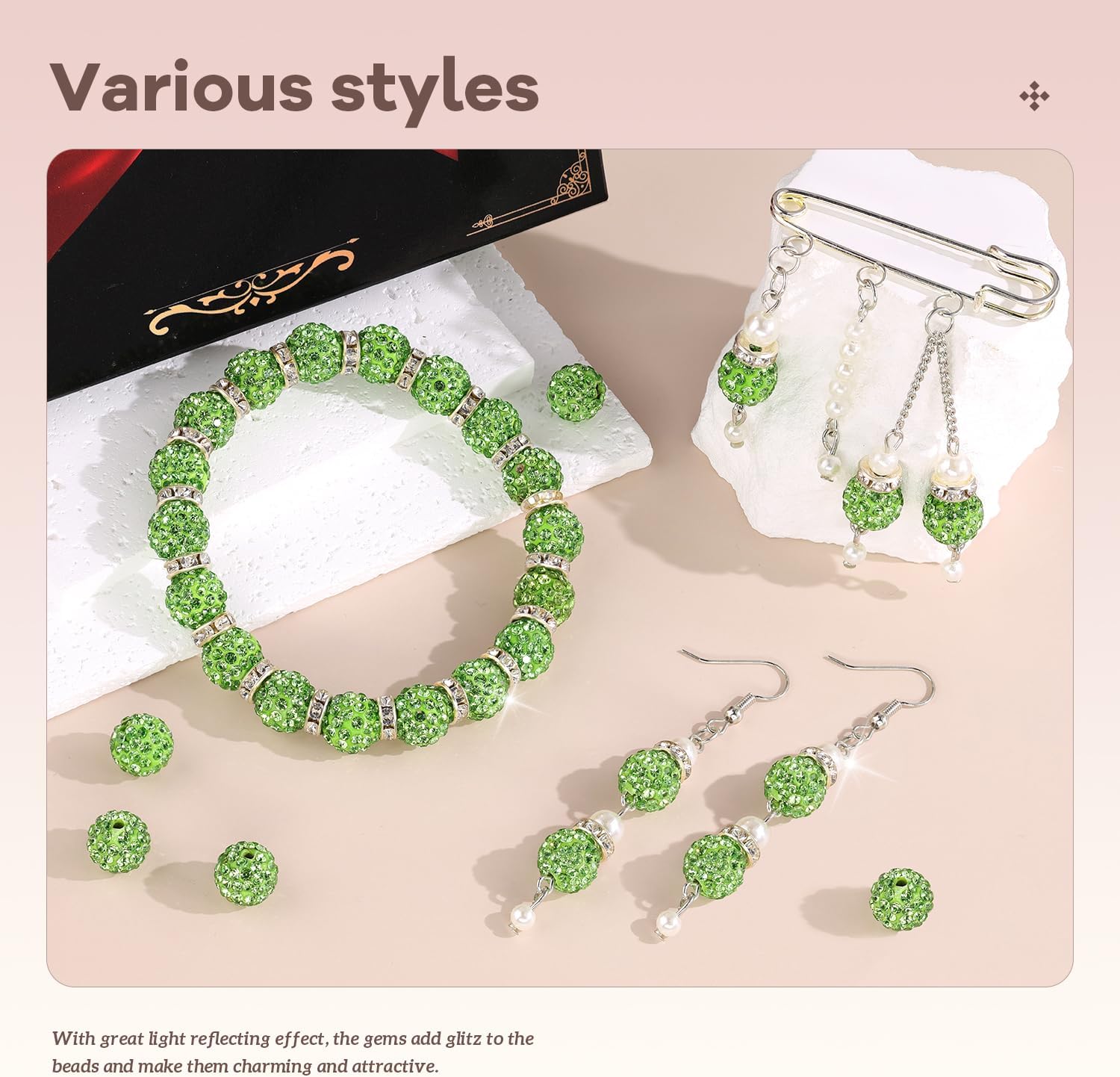 200pcs 10mm Rhinestone Beads for Jewelry Making, Light Green Shiny Round Disco Ball Beads Bulk, Sparkle Crystal Clay Christmas for Bracelet Baseball Necklace Earring Crafting and DIY