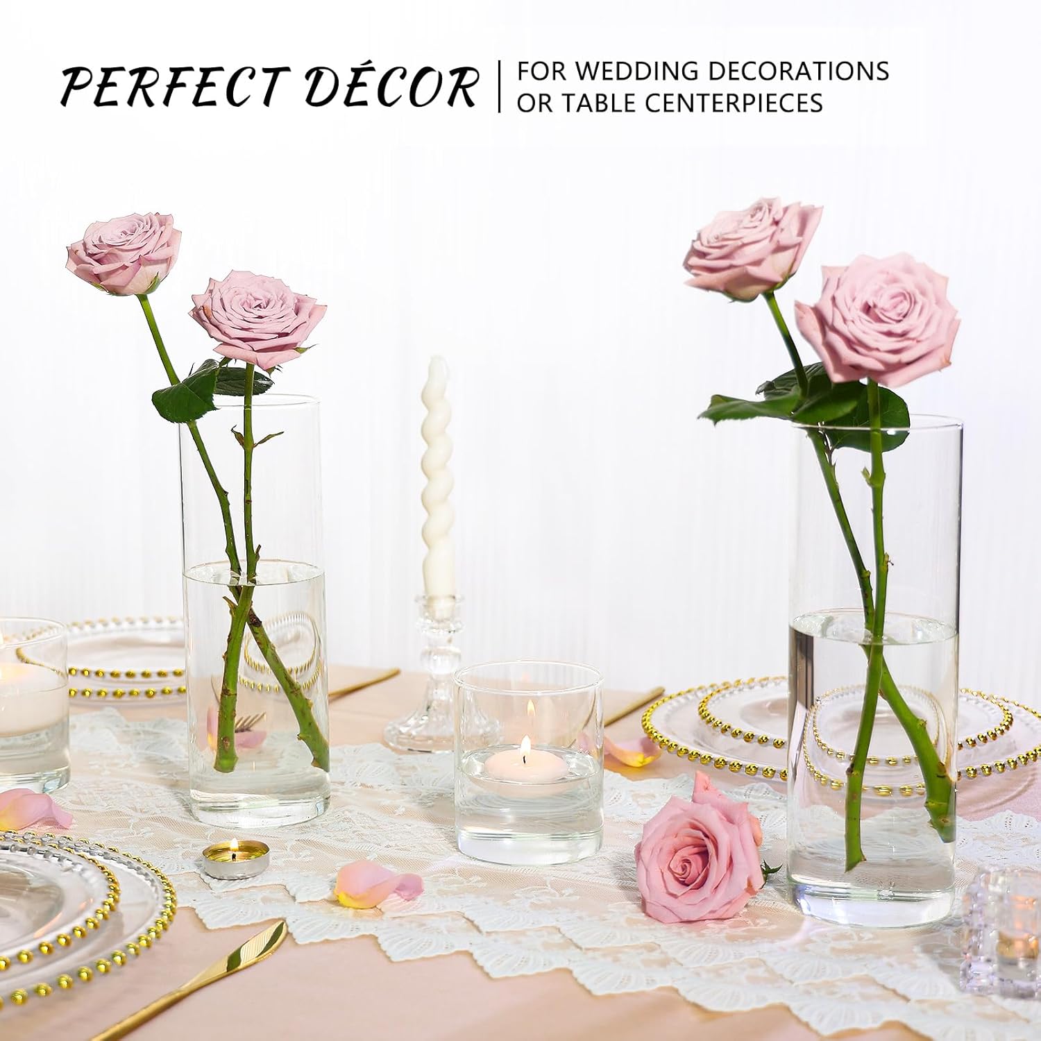 • Versatile Applications: This tall cylinder vases bulk excel as exquisite table centerpieces, elegant glass candle holders, and enchanting wedding decorations. Their universal appeal makes them an ideal choice for a wide range of occasions, including restaurants, gardens, weddings and parties.