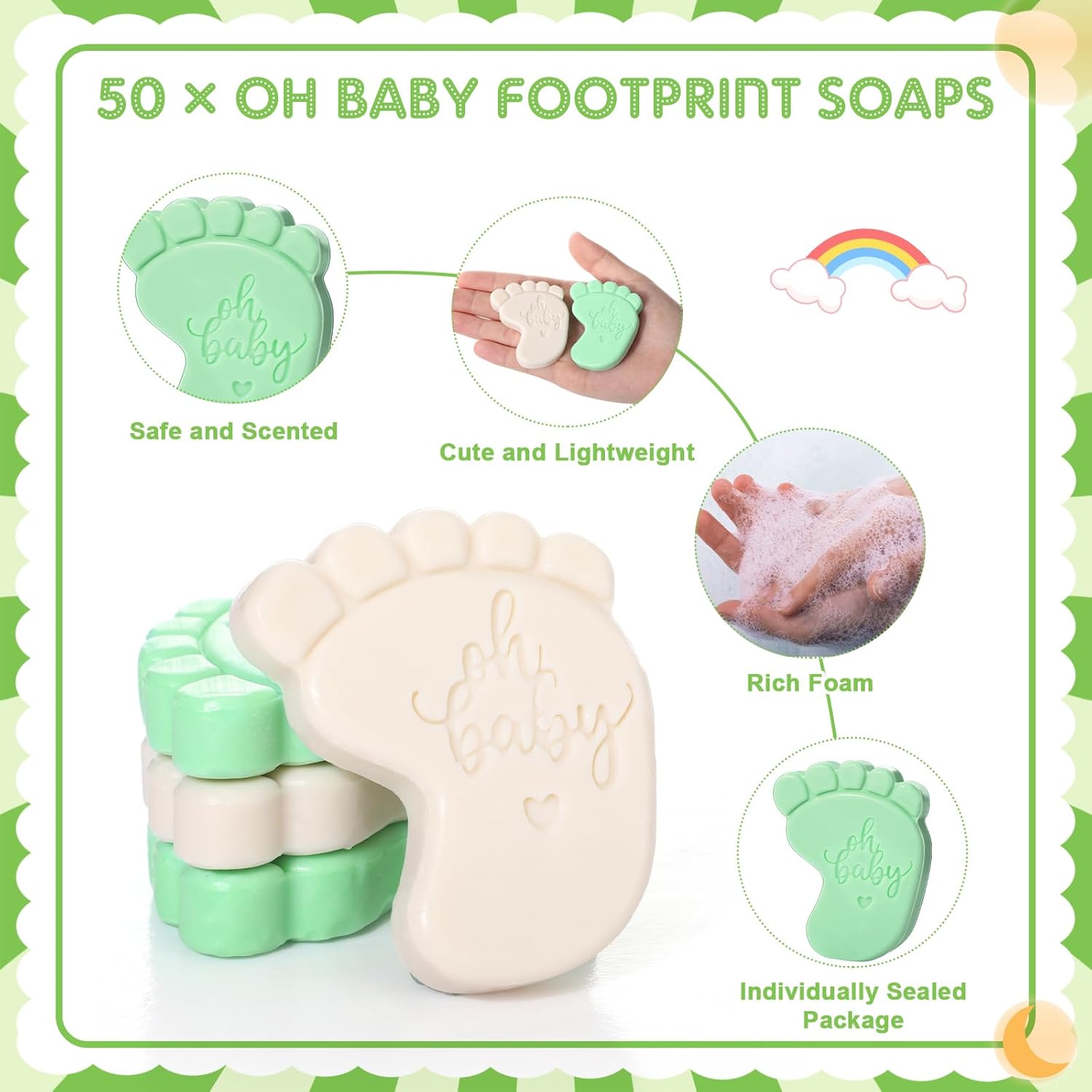 50 Sets Baby Shower Soap Favors for Guests - Mini Handmade Footprint Scented Soap with Thank You Cards and Organza Bag, Party Gifts for Gender Reveal Baptism Shower(Gray and Light Green)