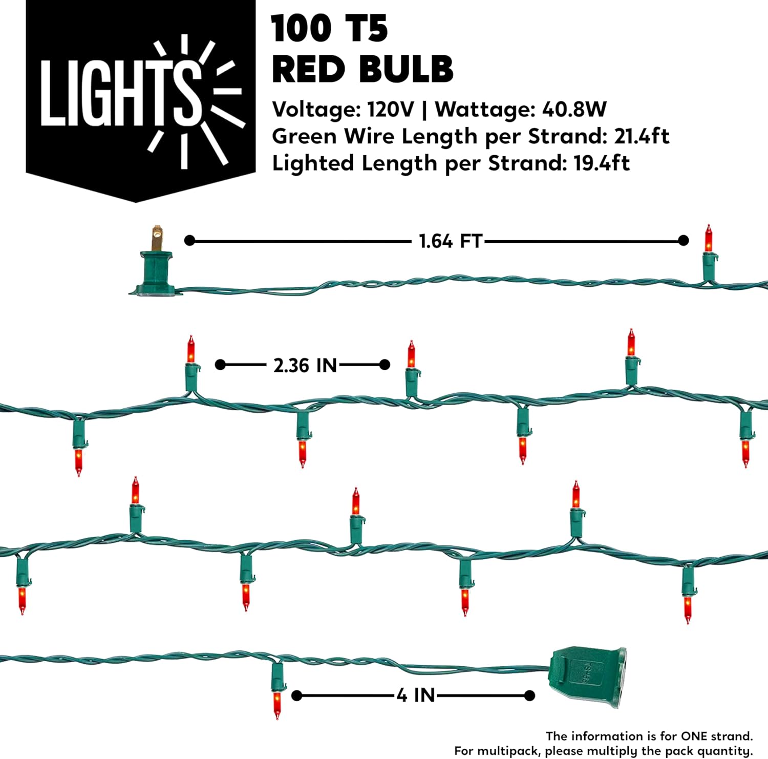 • Super Value Pack. Our Halloween incandescent string lights have a total of 100 incandescent red T5 bulbs with green wire. 40.8W 120V. Total Lighted Length is 19.4 Feet. Total Wired Length is 21.4 Feet. Bulb Spacing 2.36 inches. High Voltage.