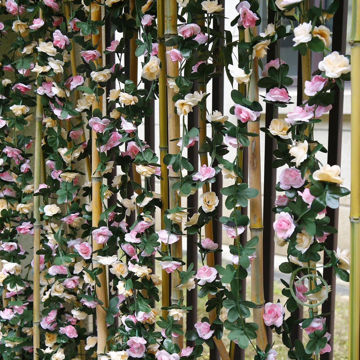 • Material: Rose floral garland is handmade from silk and plastic. The vine is soft and brightly colored, and can be bent, cut, and hung as needed