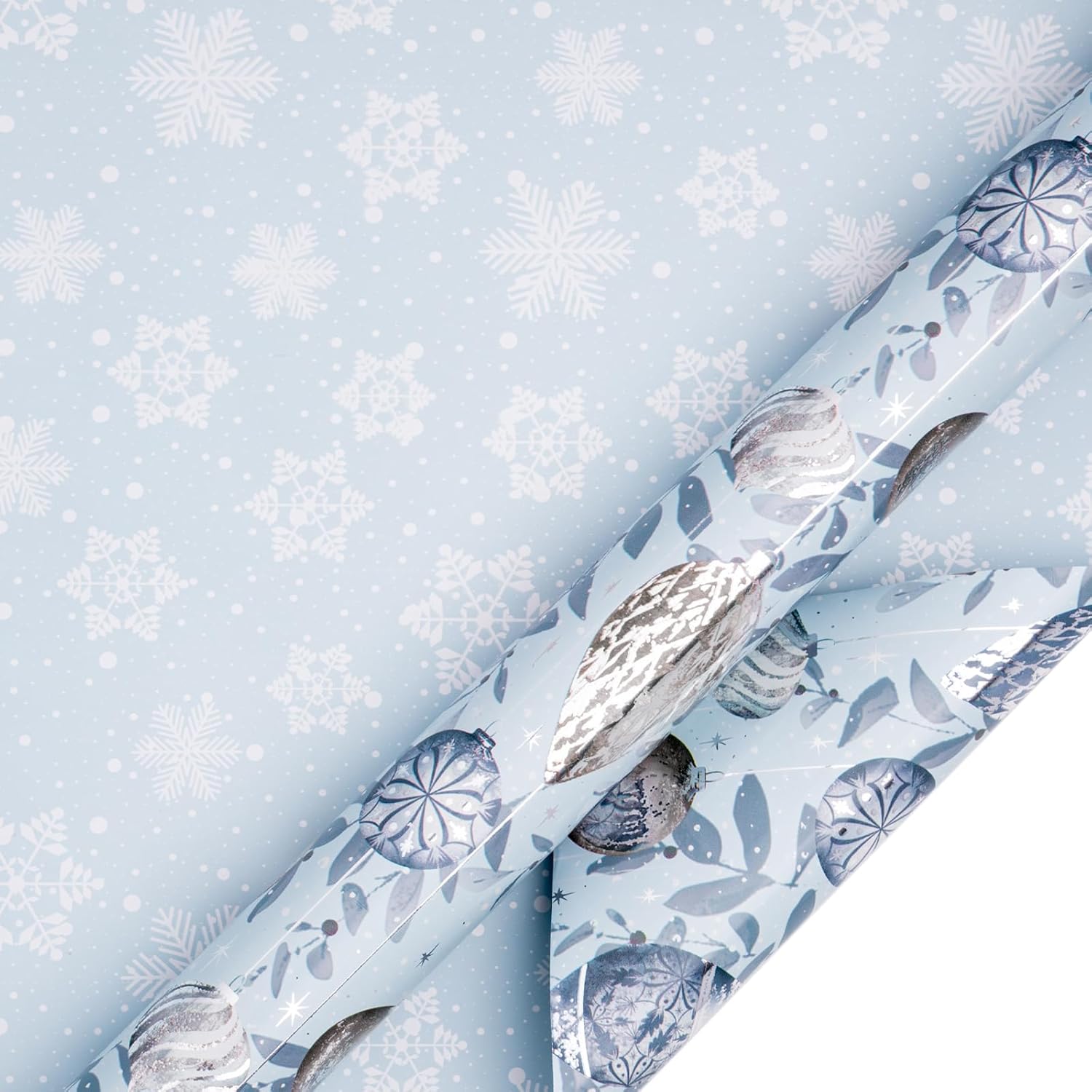 • Elegant Reversible Design: One side features vintage-inspired Christmas ornaments in silver, grey, and metallic tones hanging amidst frosted foliage; the reverse showcases delicate white snowflakes scattered over a soft blue background, offering a serene winter look.