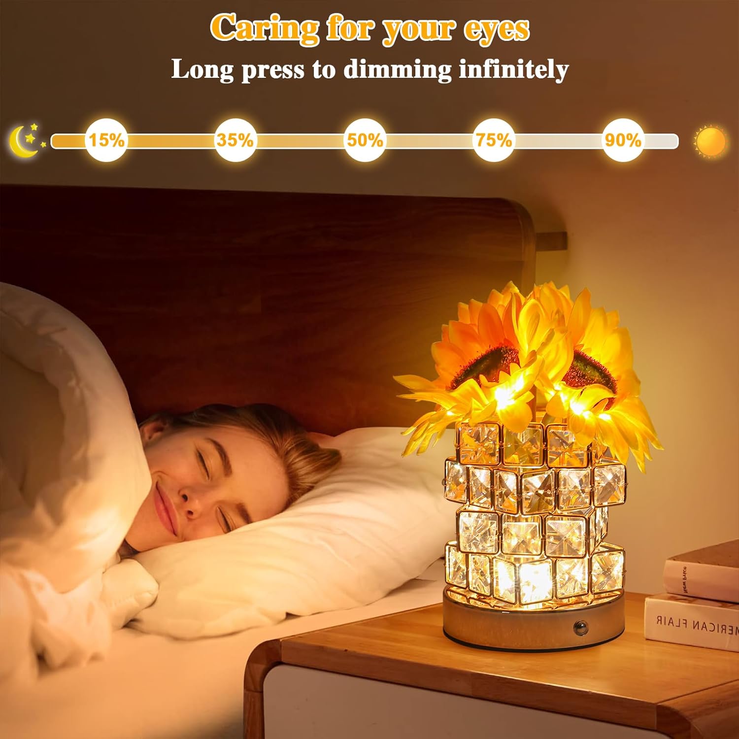 Birthday Gifts for Women/Mom Sunflower Cordless Table Lamp,3 Color Crystal Lamps Touch Bedside Lamps Infinitely Dimming with USB Charge Small Night Light,Nightstand Lamp for Bedroom (Square)