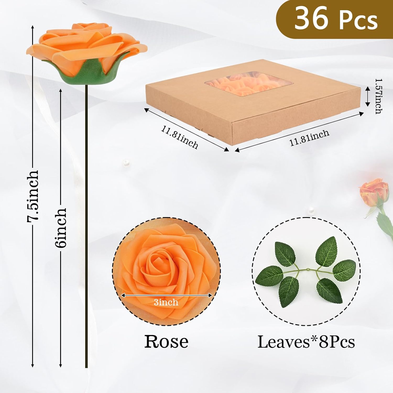 BLEUM CADE 36Pcs Artificial Flowers Fake Roses with Stems, Orange Boxed Foam Roses for DIY Bouquets Centerpieces Wedding Party Arrangement Bridal Shower Decor
