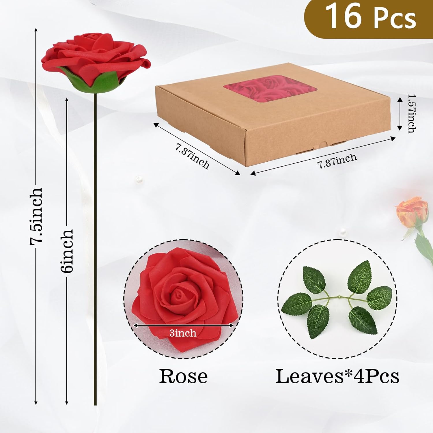 • Kindle Your Creative Flames: The box includes 16 red roses (3" flower head, 8" stem) and 4 green rose leaves, perfect for an array of DIY crafts. Whether creating wedding bouquets, graduation or birthday party ornaments, baby shower decorations, or cake adornments, our faux roses add a touch of class to every important moment.