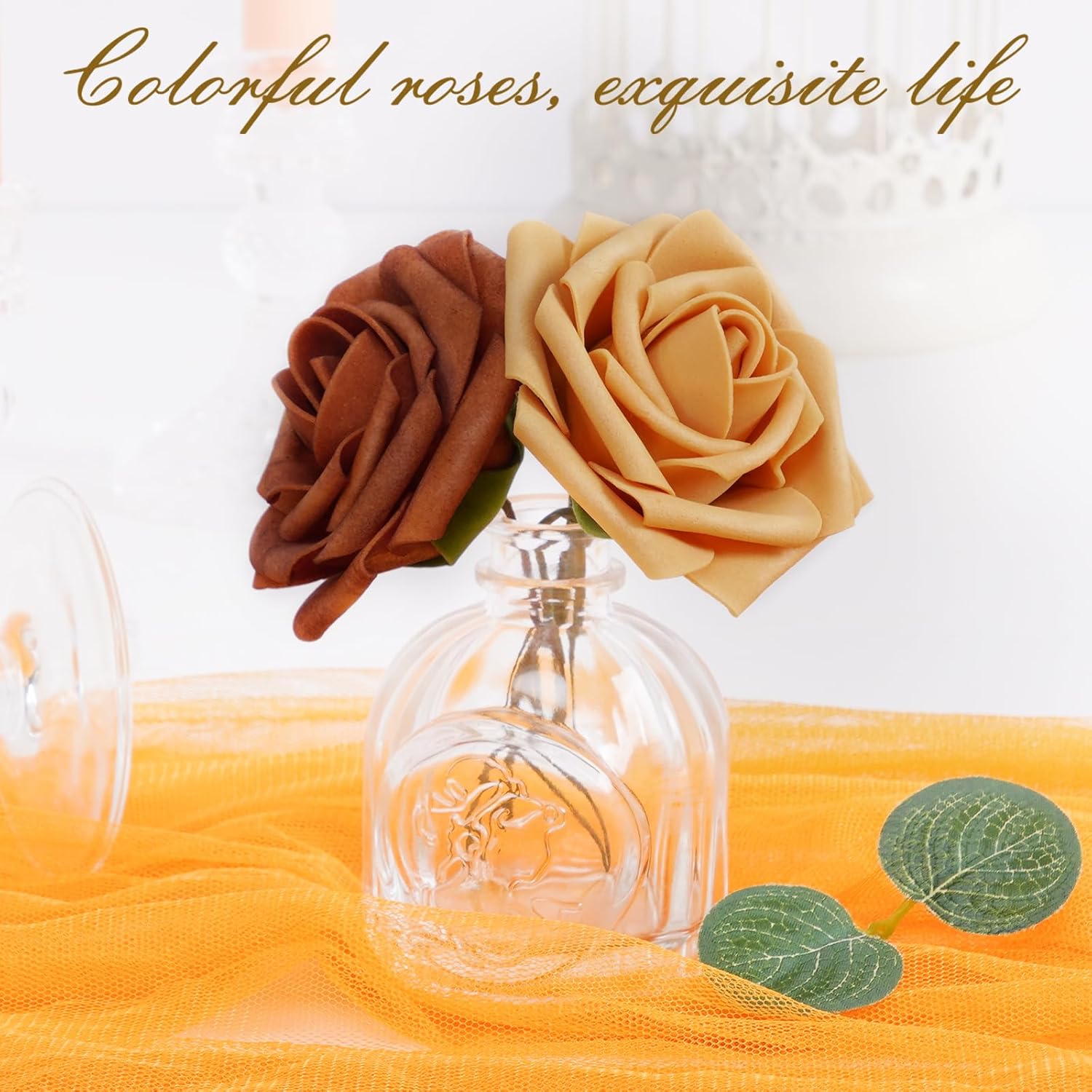 BLEUM CADE 16Pcs Artificial Flowers Fake Roses with Stems, Gradient Burnt Orange Boxed Foam Roses for DIY Bouquets Centerpieces Wedding Party Arrangement Bridal Shower Decor