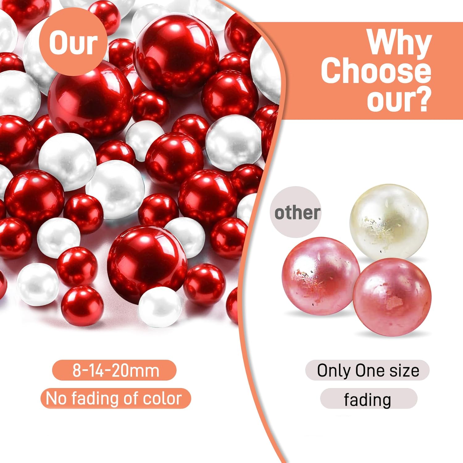 180PCS Red & White Beads for Centerpieces Vases, No Hole Polished Pearl Makeup Beads Mixed 8/14/20mm Sizes, Pearl Vase Fillers Table Scatters for Party Wedding Decor
