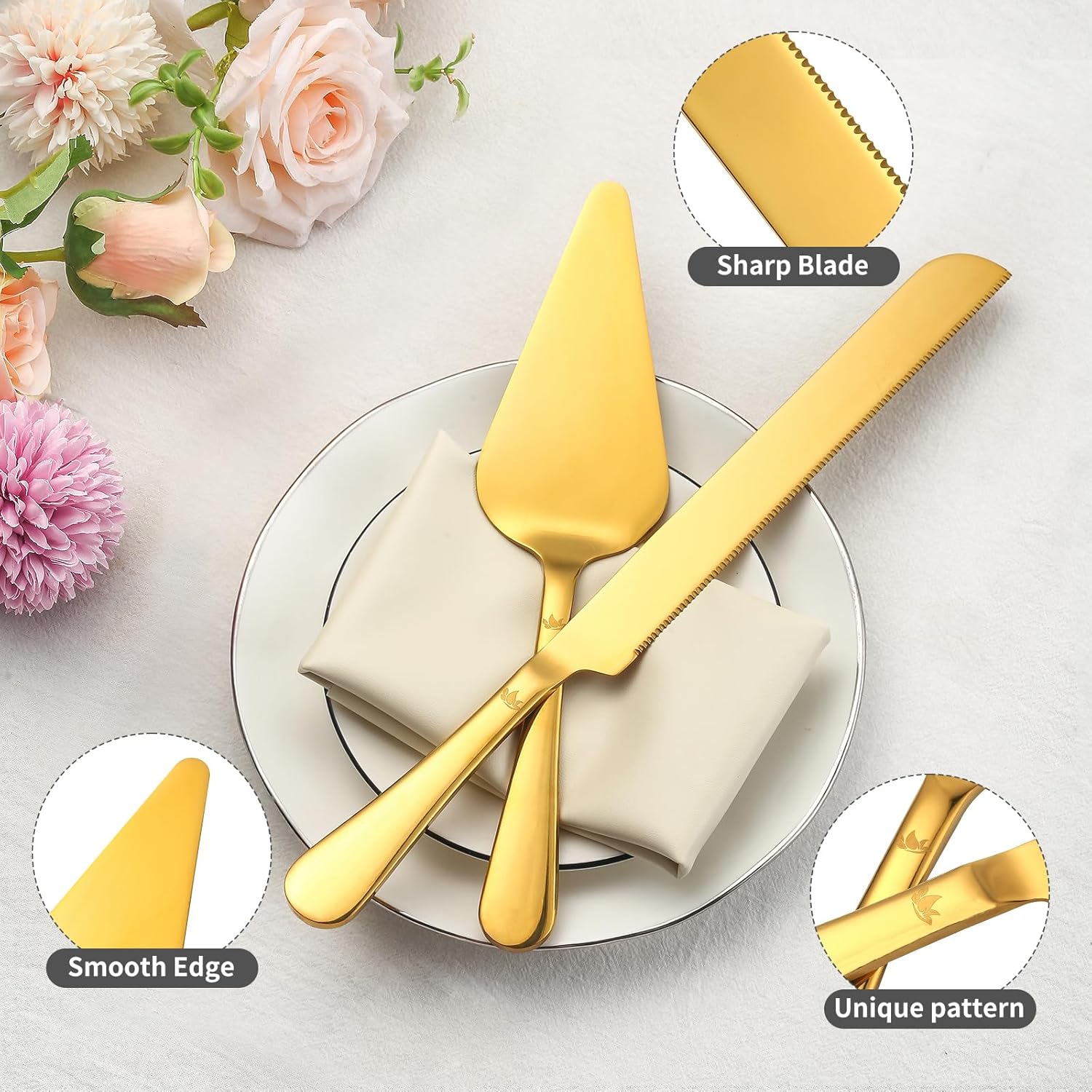 Cake Cutting Set for Wedding - Extended Cake Knife And Server Set Thickened Stainless Steel Cake Cutter and Pie Spatula Great for Birthday Anniversary Christmas Gift Gold 2 Pcs