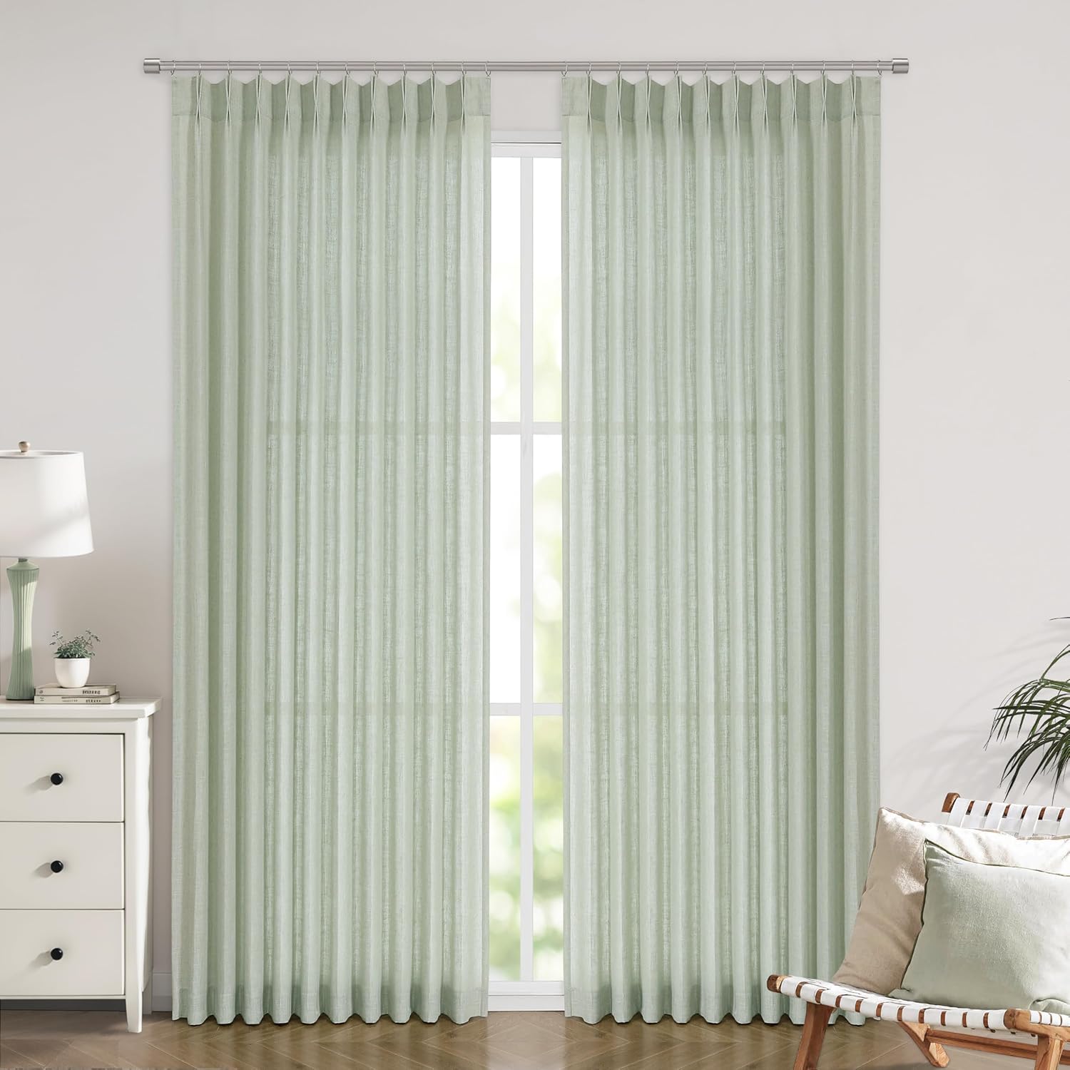 Vision Home Light Green Pinch Pleated Semi Sheer Curtains Textured Linen Blended Light Filtering Window Curtains 112 inch for Living Room Bedroom Patio Pinch Pleat Drapes with Hooks 1 Panel 60"Wx112"L