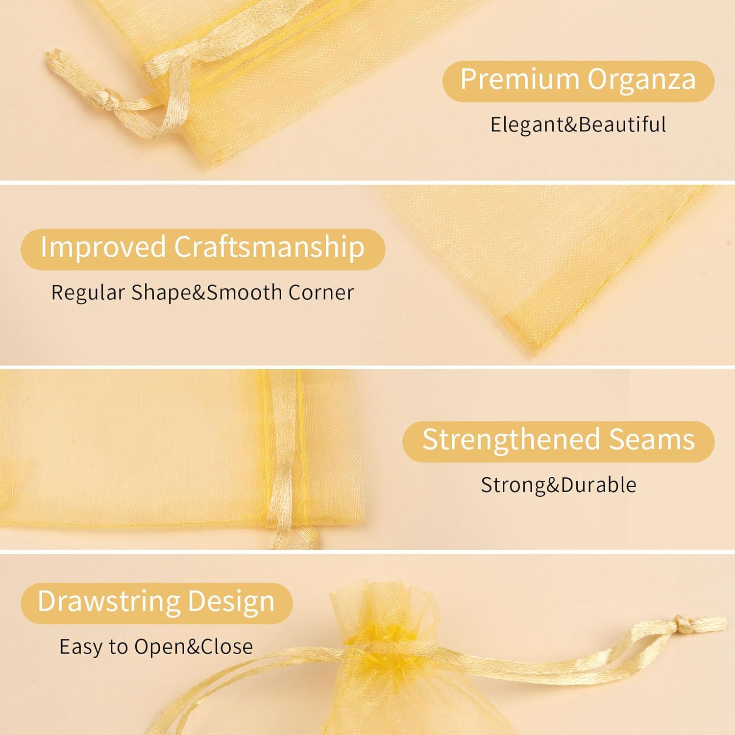 • Package Details: Package comes in 50 pcs gold organza bags, with a size of 3x4 inch, offering a practical and stylish solution for organizing and presenting small items.