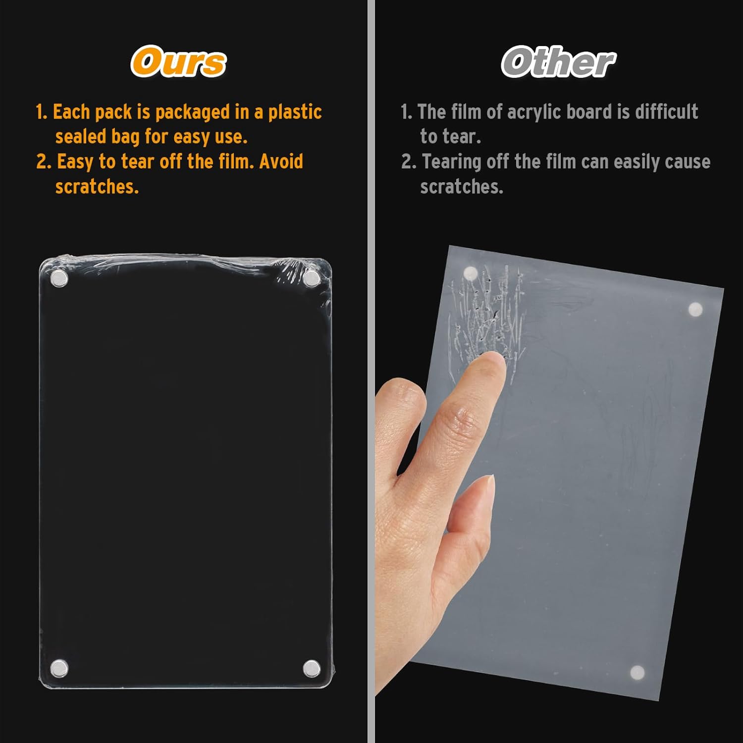• Protective Packaging and Easy to Use: Simply and slightly slide the frames apart to put or change your photo. Each set is individually wrapped with shrink film, which protects the acrylic frame and makes the packaging easy to tear off. Our packaging can avoid scratches when torn, and our packaging is easier to tear than the film adhered to acrylic. This will save a lot of time.