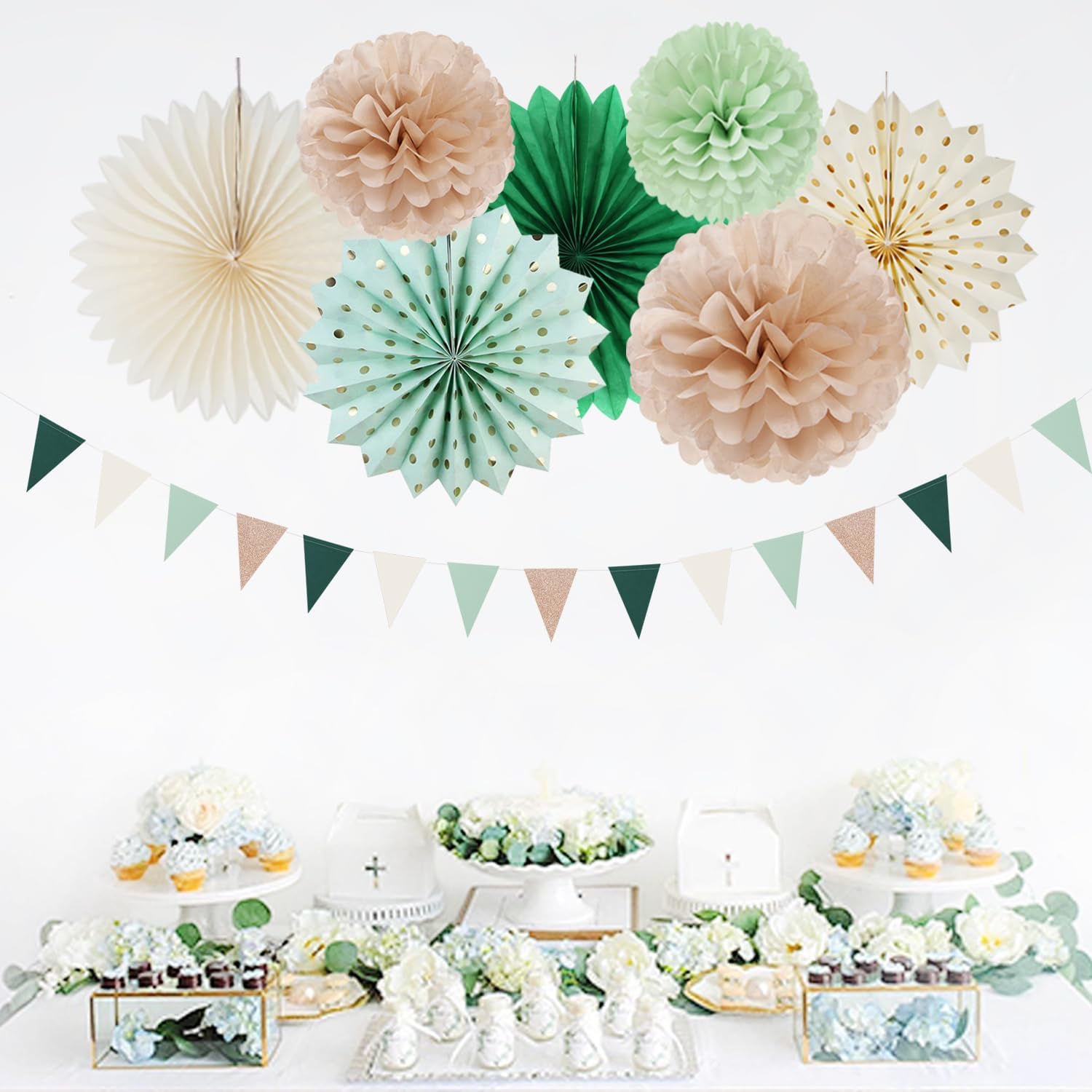 • [Package Includes] Olive-sage green champagne gold pink party decorations kit contains: 1 x triangle bunting, 4 x paper fans, 9 x tissue pom poms, 2 x honeycomb balls, 4 x paper lanterns, a total of 20 pieces of various sizes of decorations. Better embellish your party.