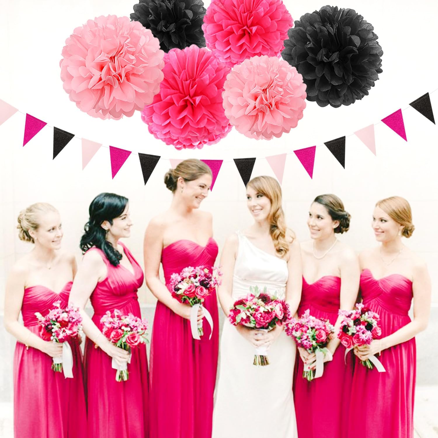 • 【Package Contains】The hot-pink black party kits include 6pcs tissue paper flowers: 3pcs 8" and 3pcs 10" in three color, 1pcs Triangle Flags,1pcs circle dots paper garland,15pcs tassel garland. Total 23pcs.