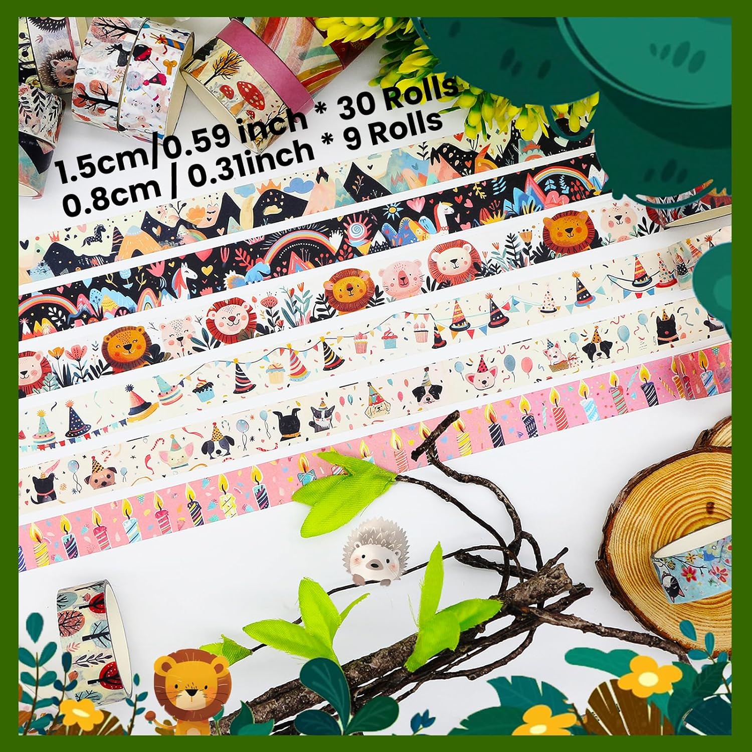 Washi Tape Set 39 Rolls - Cute Animal Colored Decorative Adhesive Tape for Kids, Masking Tape for Scrapbooking Supplies, DIY Crafts, Gift Wrapping, Junk Journal, Planners, School Supplies