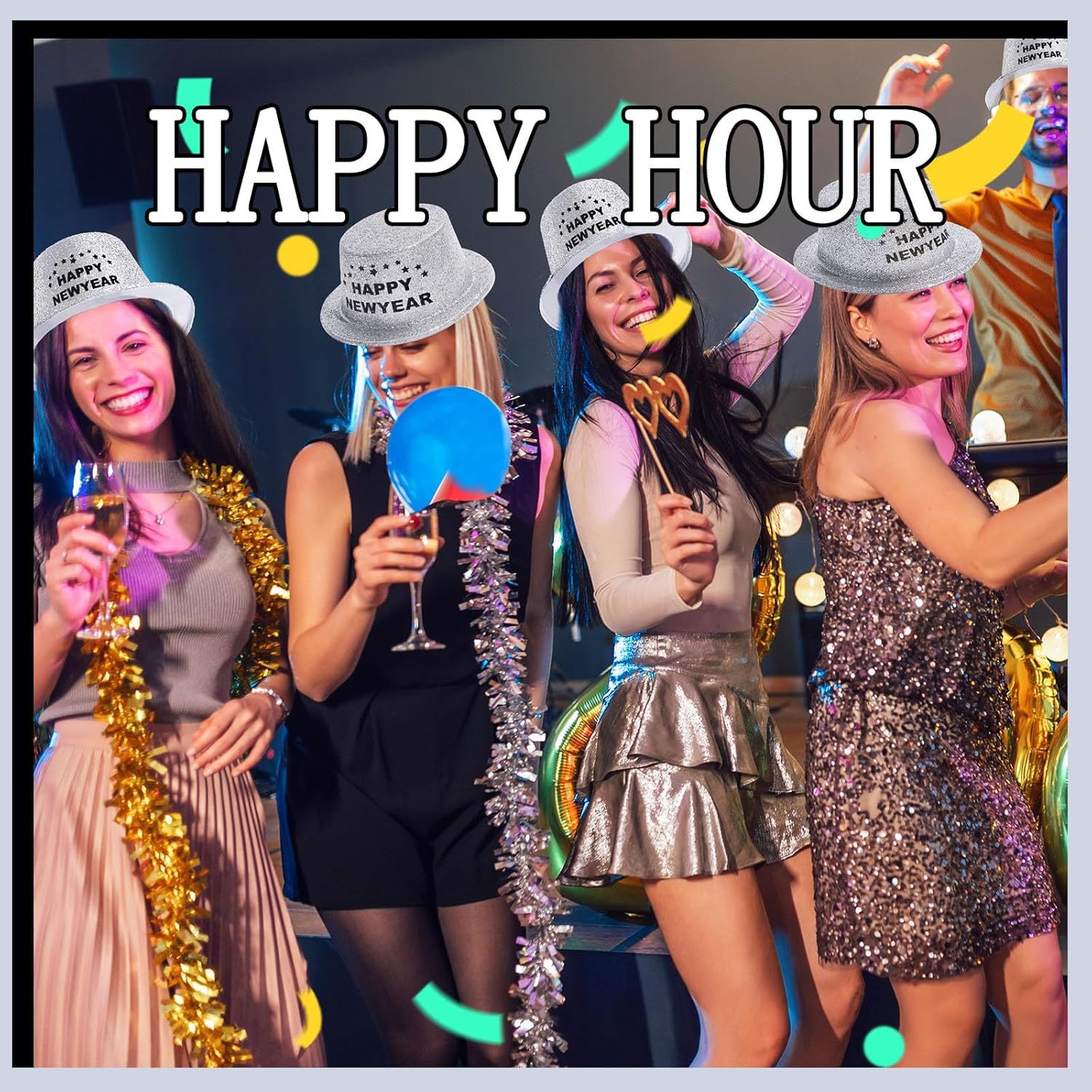 Hillban 12 Pcs Top Hats Halloween Glitter Plastic Retro Disco Party Hats for Halloween Magician Birthday Wedding Carnivals(Silver with Letter,Novel)