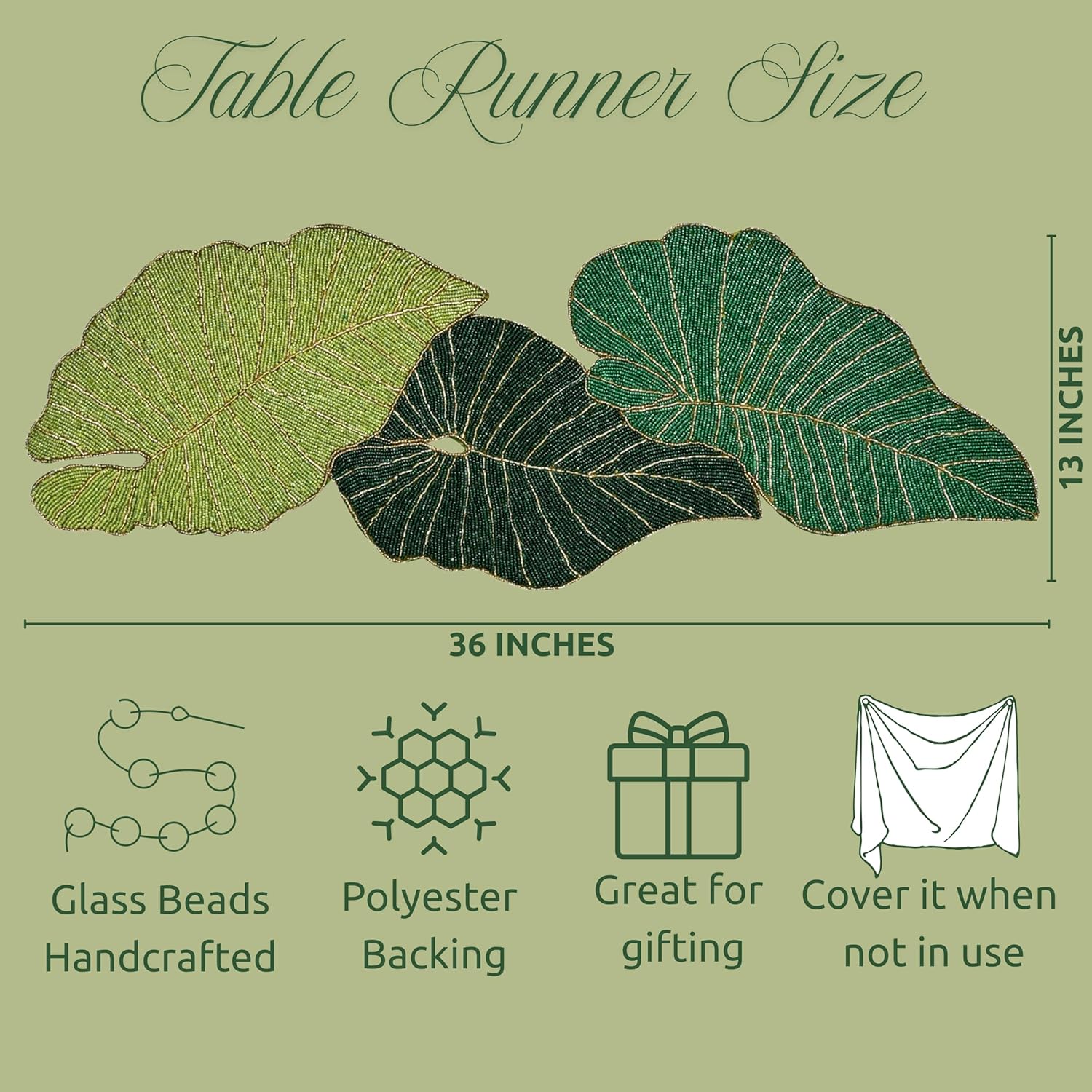 Luxury Beaded Table Runner - 13x36 Inches Handcrafted Leaf Pattern with Glass Beads & Polyester Back - Elegant Table Decor for Dining, Coffee Table & Events (Green) - CLEENTABLE