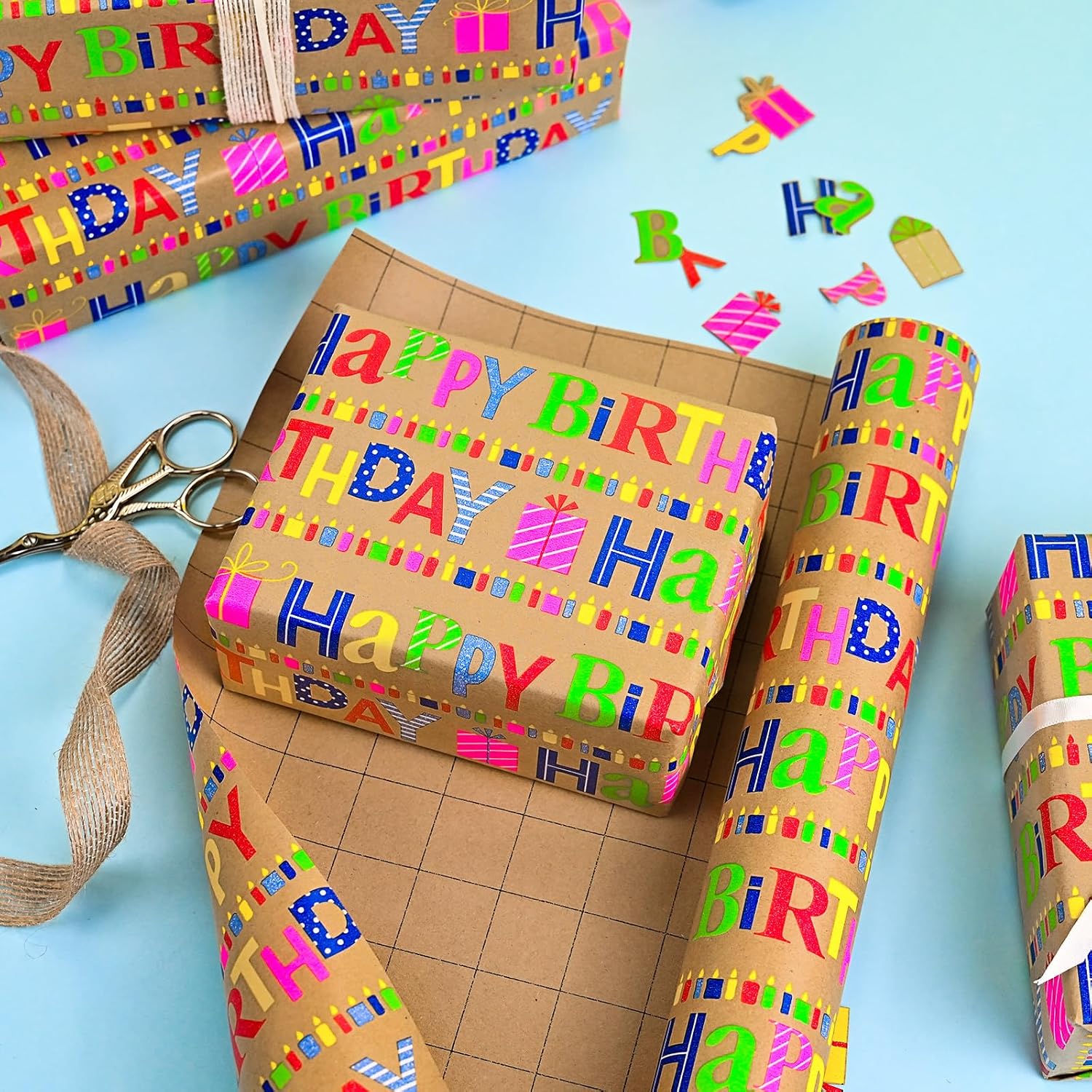 • BIRTHDAY KRAFT WRAPPING PAPER: Featuring vibrant happy birthday messages on a kraft-paper background, brighten up a birthday for a kid or kid-at-heart with this colorrful birthday wrapping paper.