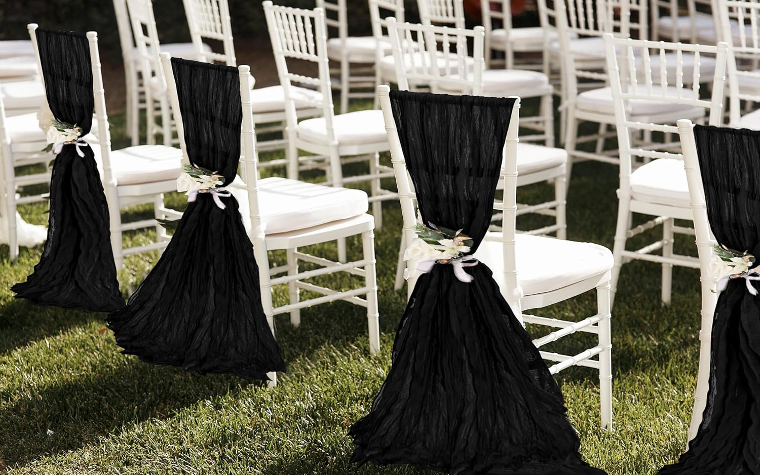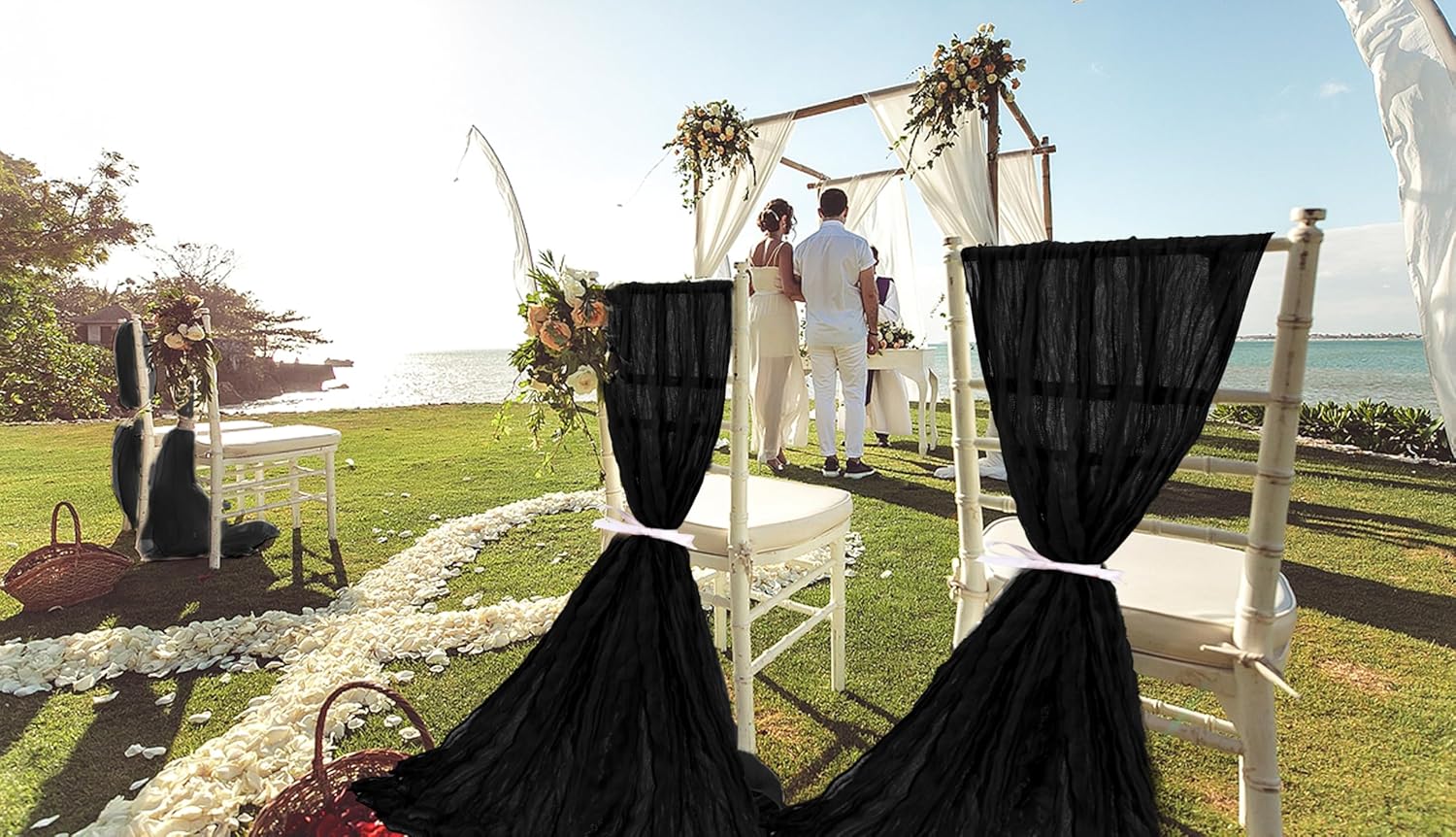 • 【Delicate Craftsmanship】Black cheesecloth chair sashes adopt unique pleated workmanship, and the overall appearance is simple and elegant, creating an elegant and romantic atmosphere easily. The edges are carefully stitched to keep a perfect flowing condition, will not get broken or loose easily, can serve you for a long time
