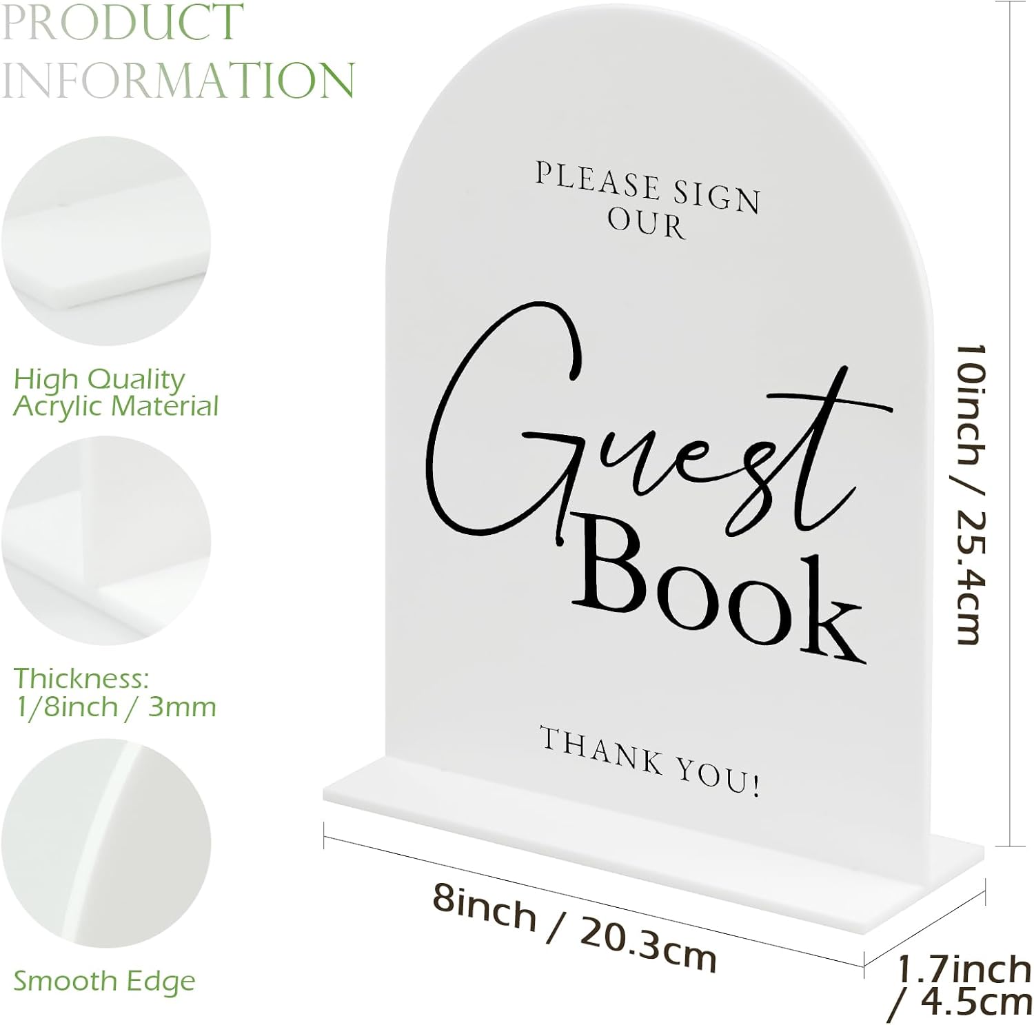 • Package Includes: You will receive a 8x10 inch white arch acrylic guest book sign with base, smooth edges,1/8 inch thick.