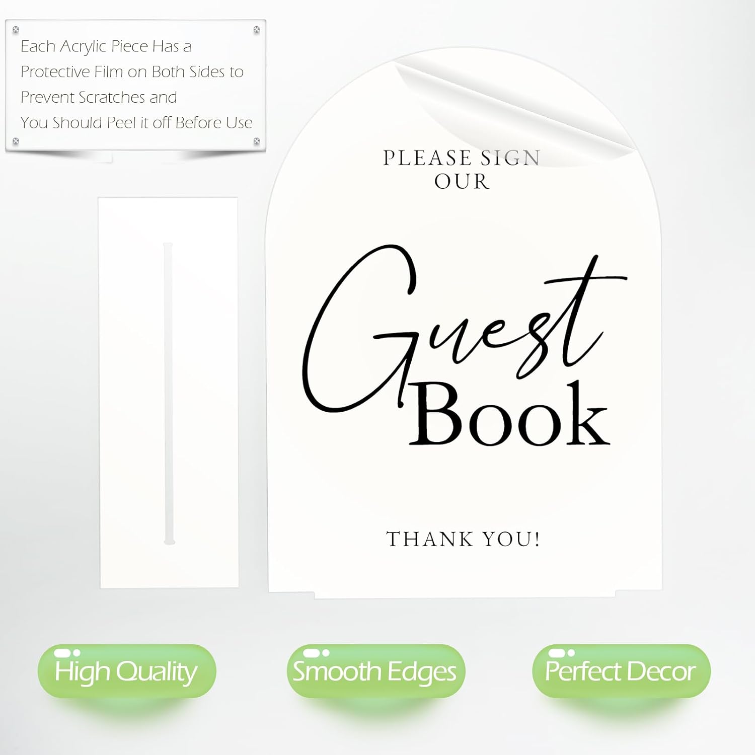 • Protsctive Film: Each white arch acrylic guest book sign has a protective film on both sides to prevent scratches and when you are ready to use it, you should peel it off.