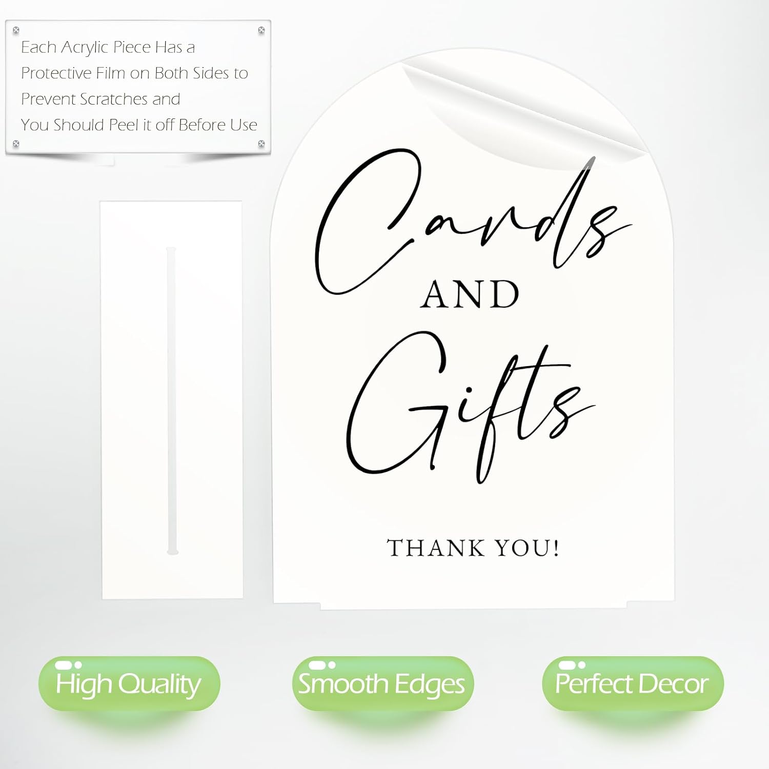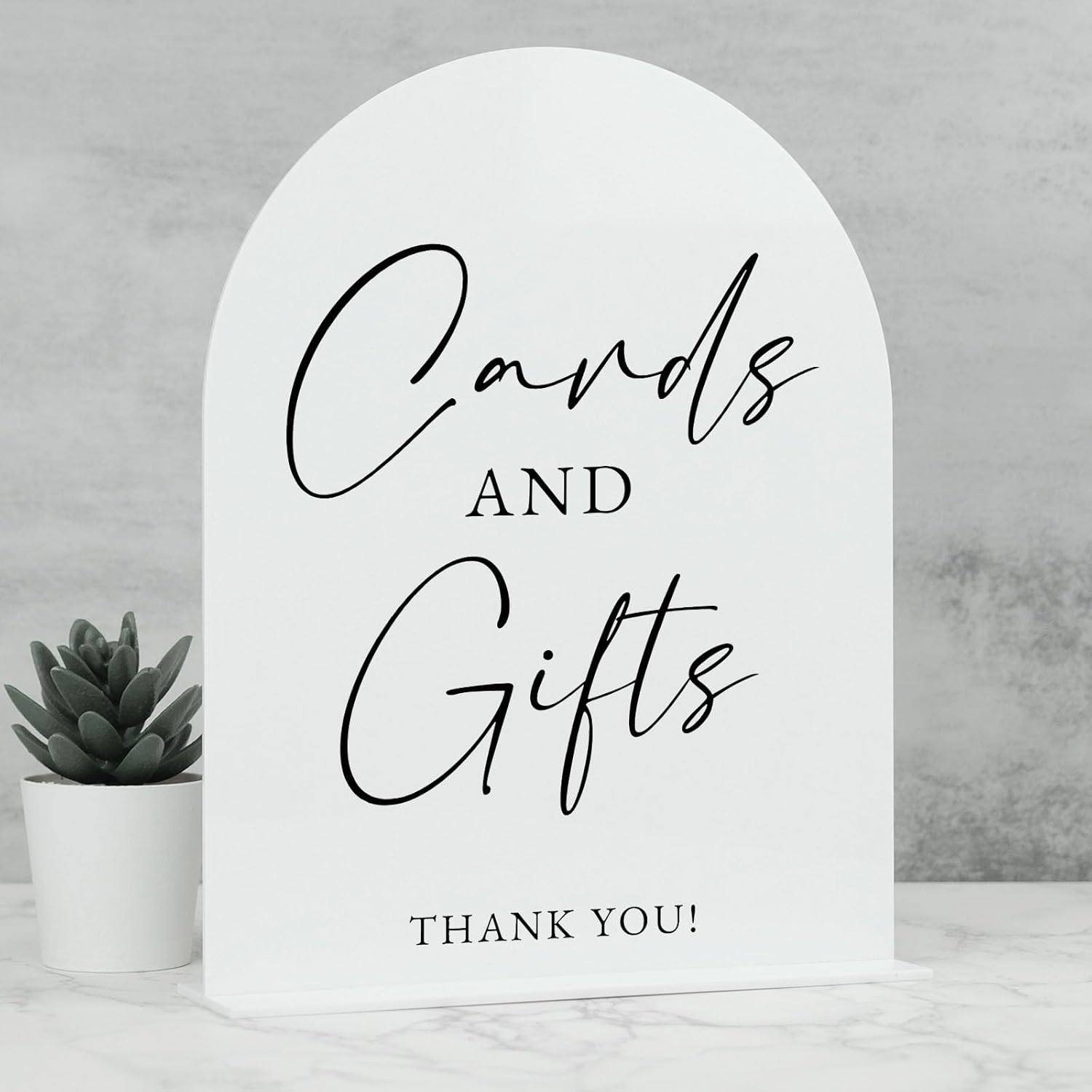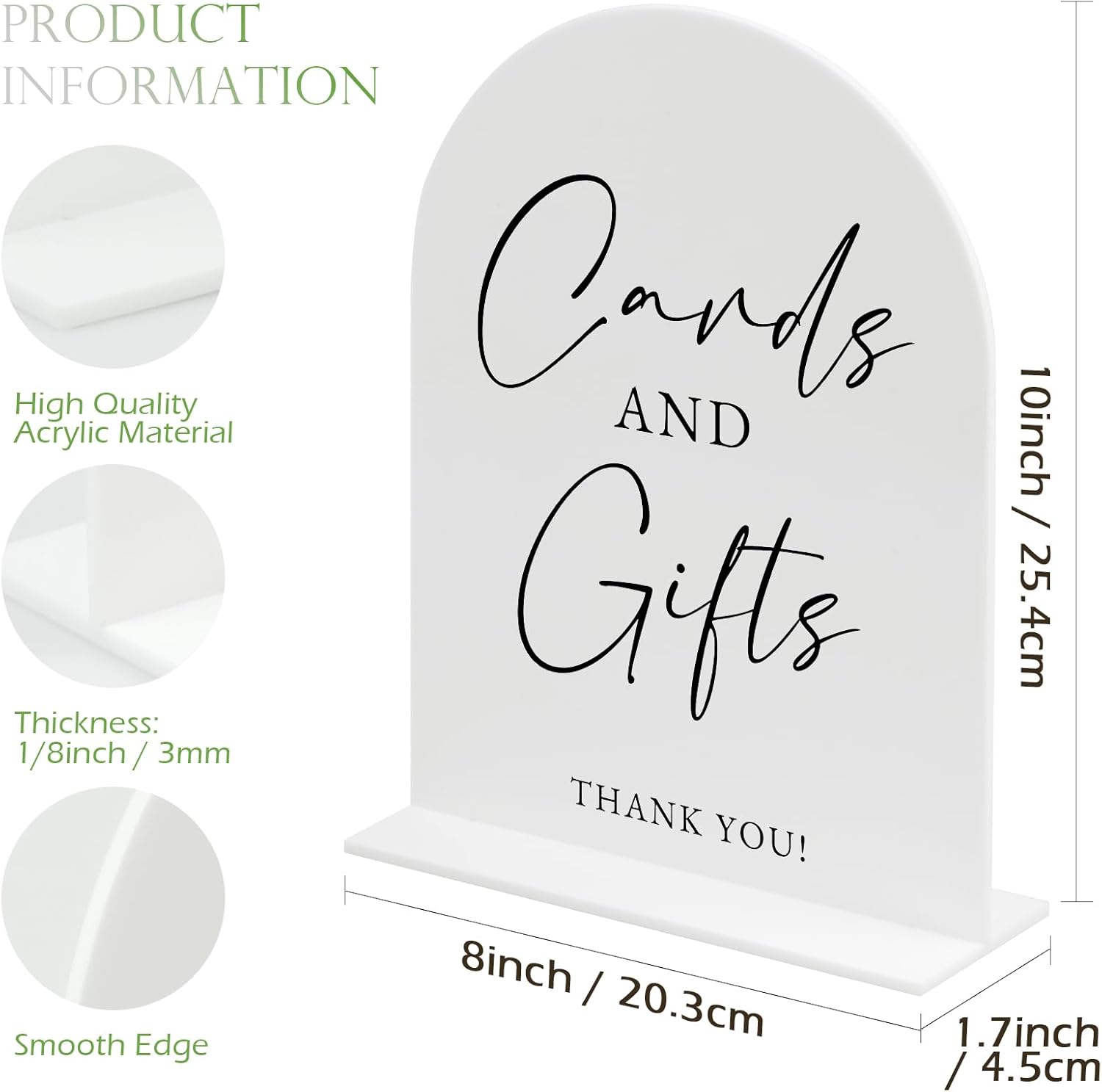 • Stable and Durable: Our white arch acrylic cards and gifts sign easily fits into the slot located in the middle of the acrylic base, ensuring it stays upright and securely in place. The acrylic sign base is made of 1/8" thick acrylic material, sturdy and durable, they can keep the table cards stand steadily.