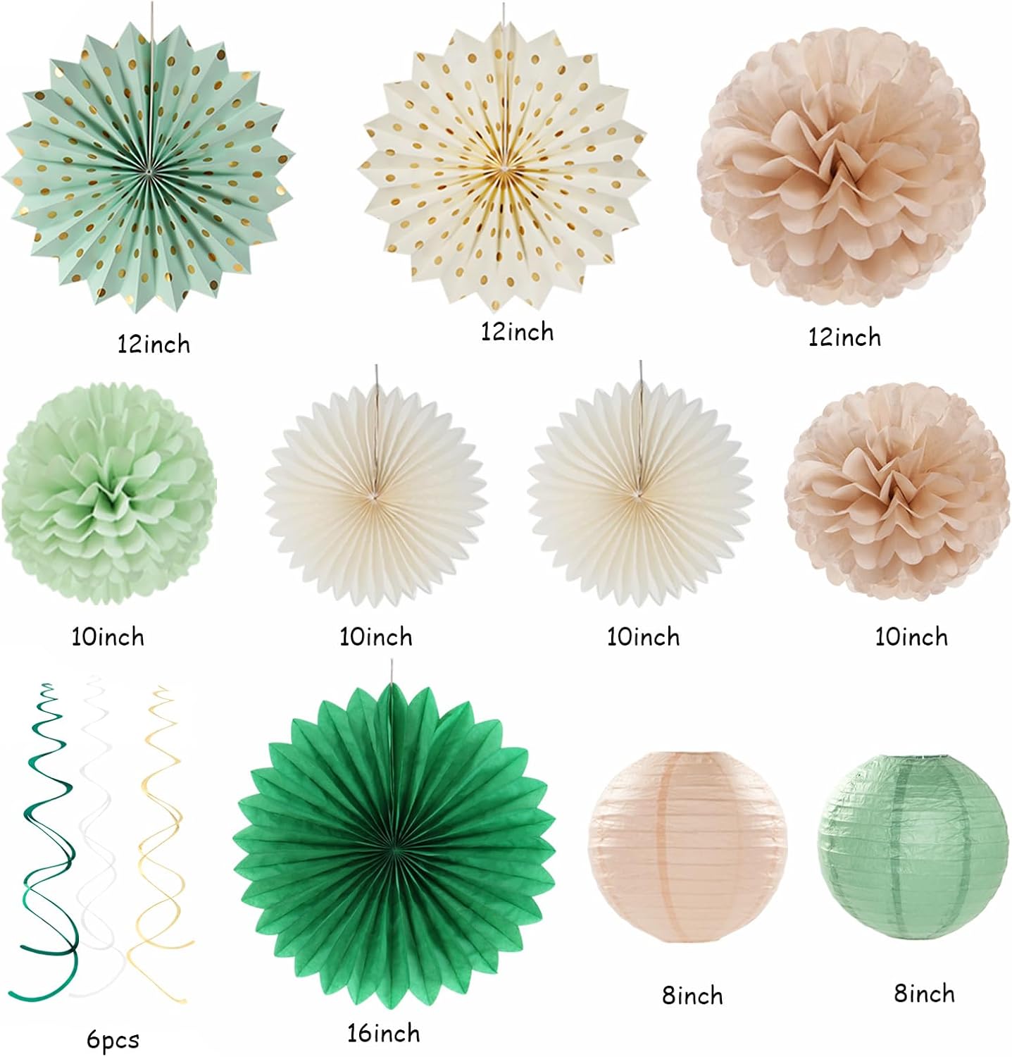 • Package Including:The olive sage green beige champagne gold ivory party decorations 1pcs paper garland dots,1pcs Triangle Flags in three color,15pcs tassel garland in four color,2pcs 8” paper lantern,6pcs streamers in three color,2pcs 10” paper lantern fan,2pcs 10” honeycomb ball in two color,1pcs 12”paper lantern fan,1pcs 12” honeycomb ball,1pcs 16”paper lantern fan.
