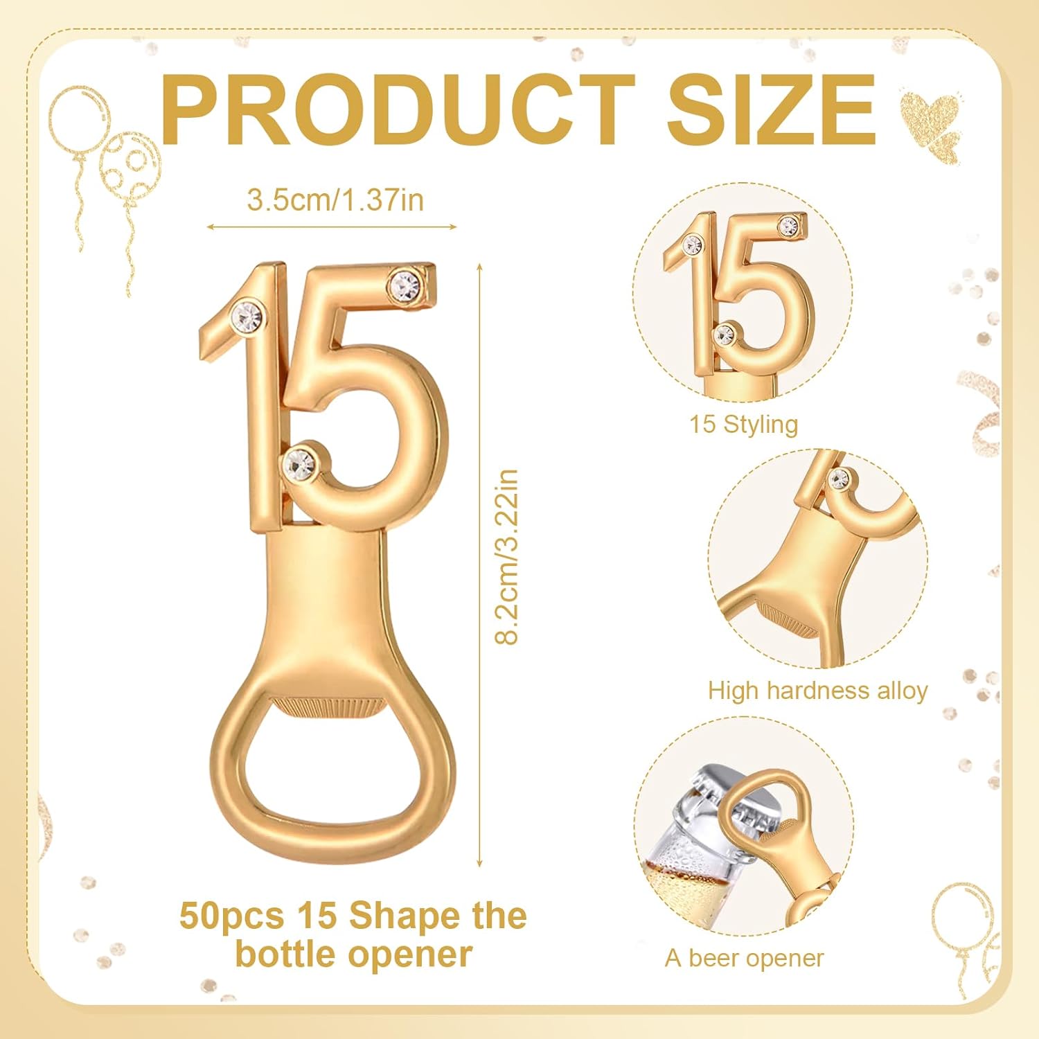 50Pcs 15 Gold Bottle Openers For 15th Birthday Party Favor 15th Birthday Bottle Opener Set Gift For Girls Boys Wedding Anniversaries Souvenirs Favor Party Quinceañera Recuerdos