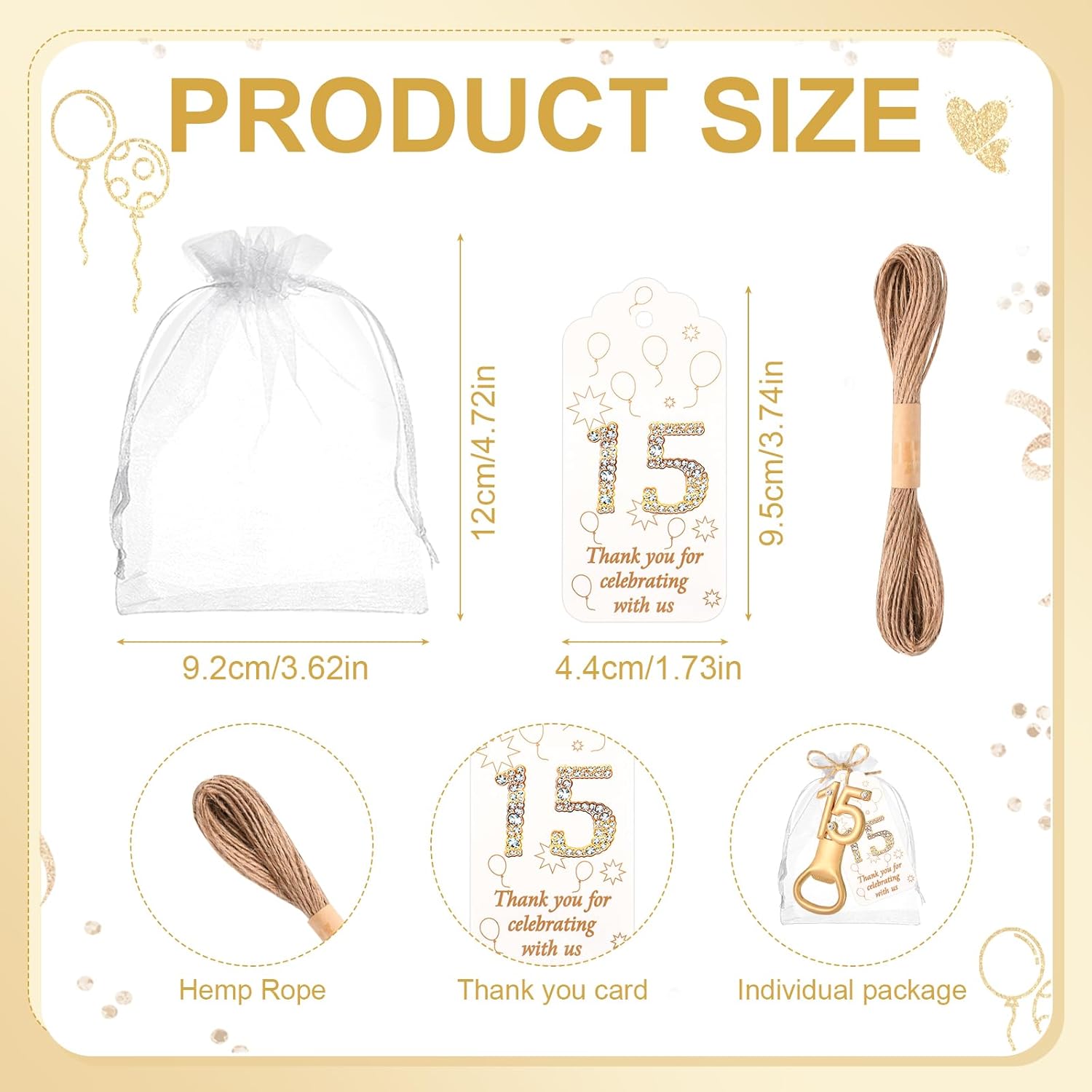 • Versatile Use: Our 15th Gold Bottle Openers for 15th Birthday Party Favors are perfect for various occasions, including weddings, anniversaries, and birthday parties. Whether you're celebrating a milestone event or simply want to show appreciation to your guests, these favors are versatile enough to fit any theme