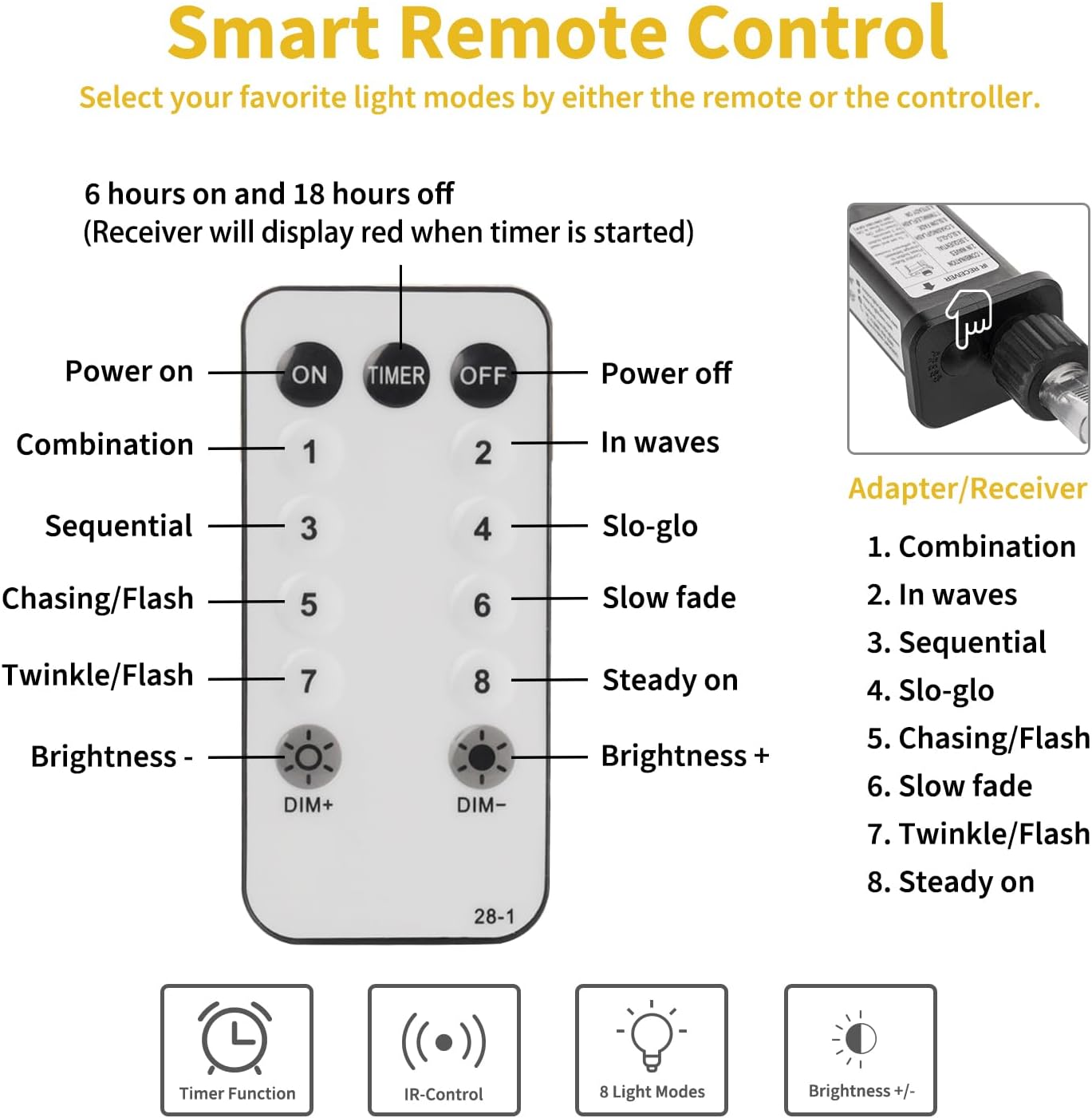 • Modes & Memory Function - The string lights have 8 lighting modes: Combination, in waves, sequential, slogs, chasing, slow fade, twinkle, steady on. With a memory function, the mode that is turned on again after being turned off is that before turning off.