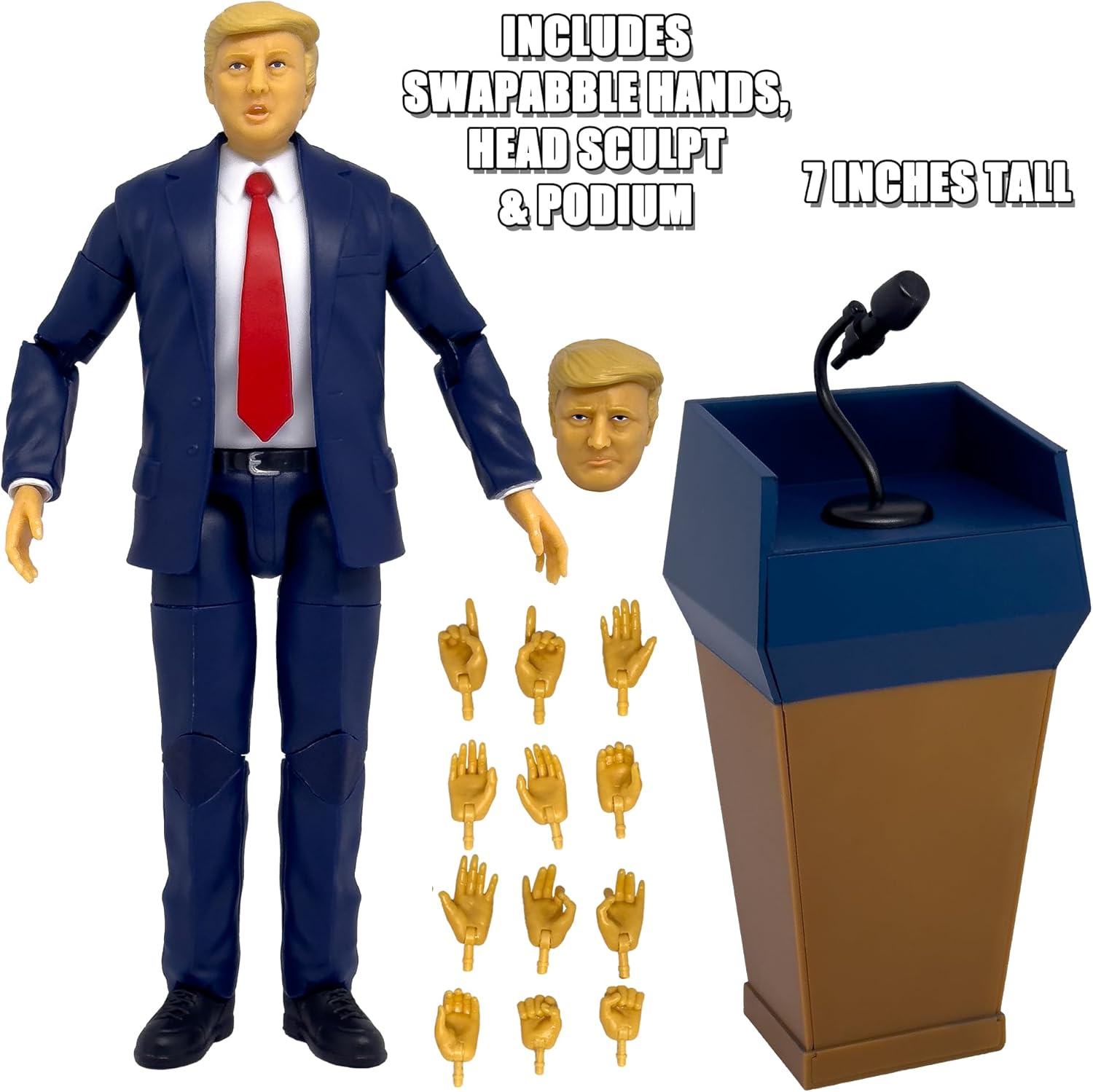 • Standing 7 inches tall and featuring a highly detailed head sculpt, this presidential figure includes a full suit outfit, lifelike expression, and built-in sayings with multiple iconic phrases! Whether giving a rally speech or addressing the nation, this figure is perfect for display or political play.