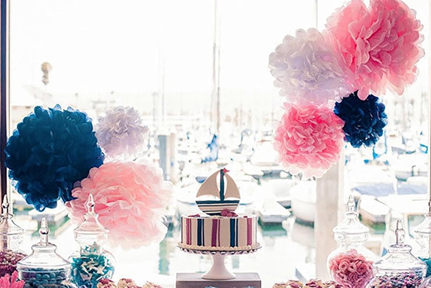 • PAPER FLOWER POM POMS Used in lieu of balloons, for they are more lightweight. They can be scattered as dessert table decor, or placed in vases as unique centerpieces. You can create a wonderful backdrop for your family or friends with it