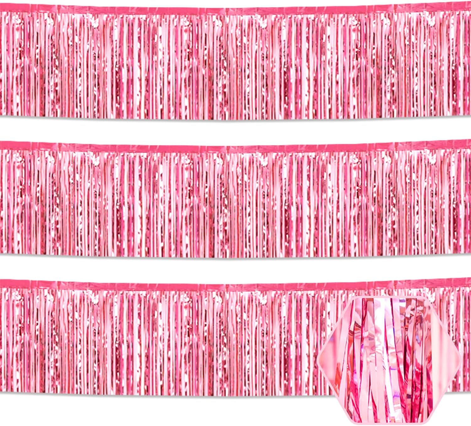 3 Pack 10 Feet Pink Foil Fringe Garland Metallic Tinsel Streamers Banner Wall Hanging Curtain Backdrop for Parade Floats, Christmas Day, Valentine's Day, Thanksgiving, Birthday Party Decorations