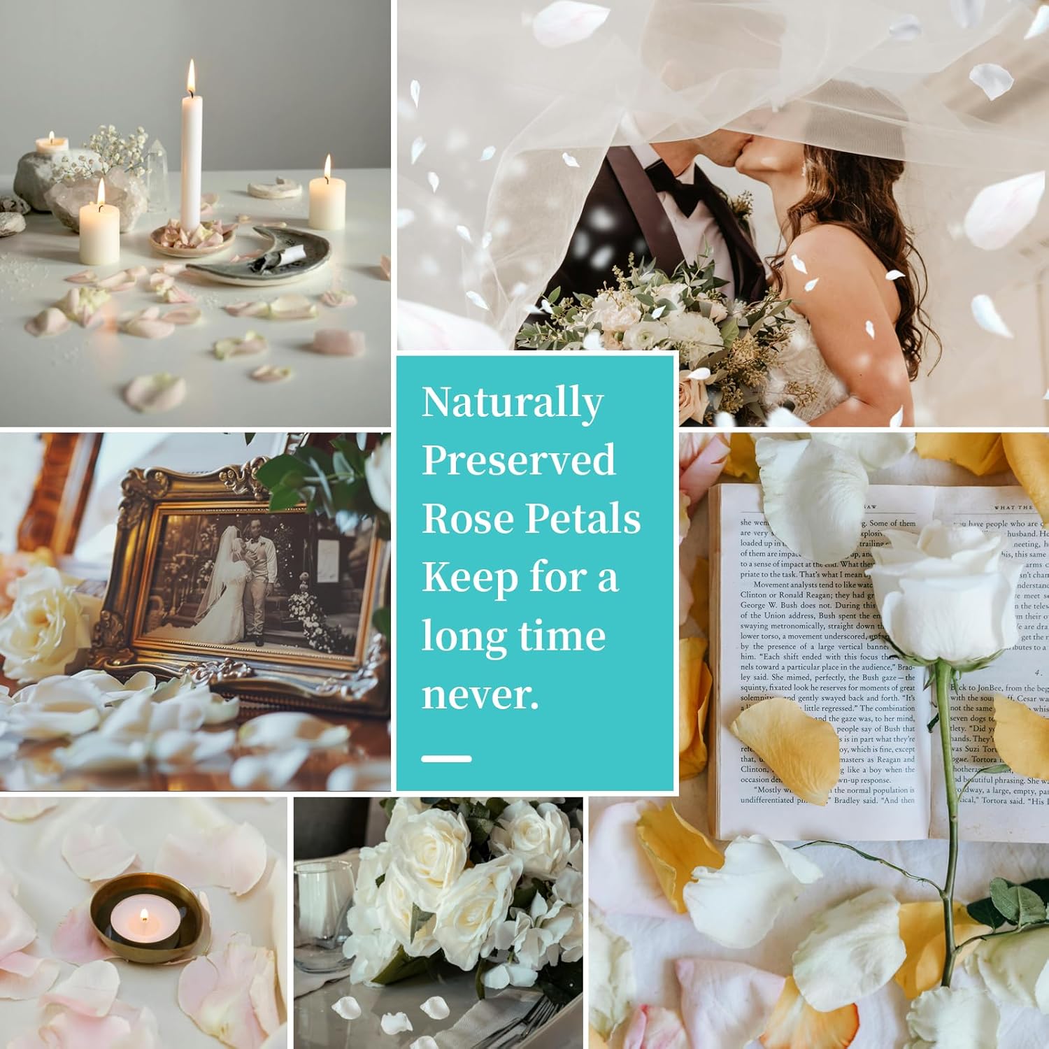 • Elegant Ivory: The petals are about 1.5*1.5 inches in diameter and weigh about 3.17 oz, with approximately 300 pieces. The natural petals come in various sizes and shapes. Like many white flowers, white roses symbolize peace, innocence, purity, loyalty, and eternity, making them perfect for proposals, anniversaries, or romantic nights