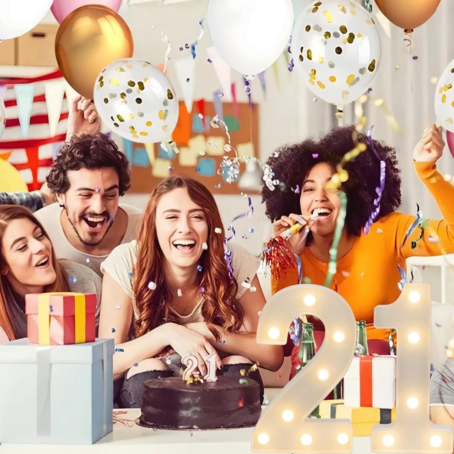 • 【Light Your Birthday Day】 Light up your birthday party with our light up letters spelling out ''21''.Light up the wonderful moments with LED number lights, warm color lights create a warm atmosphere, make your 21th birthday party more unforgettable and sparkling!